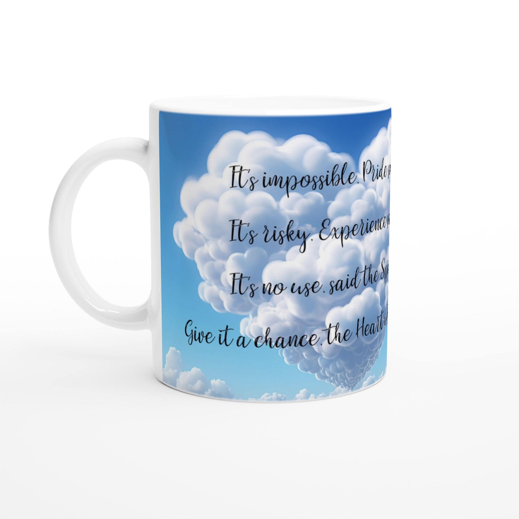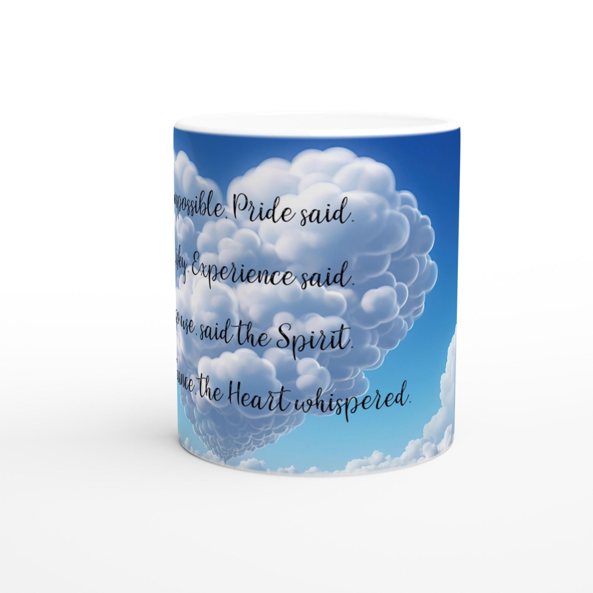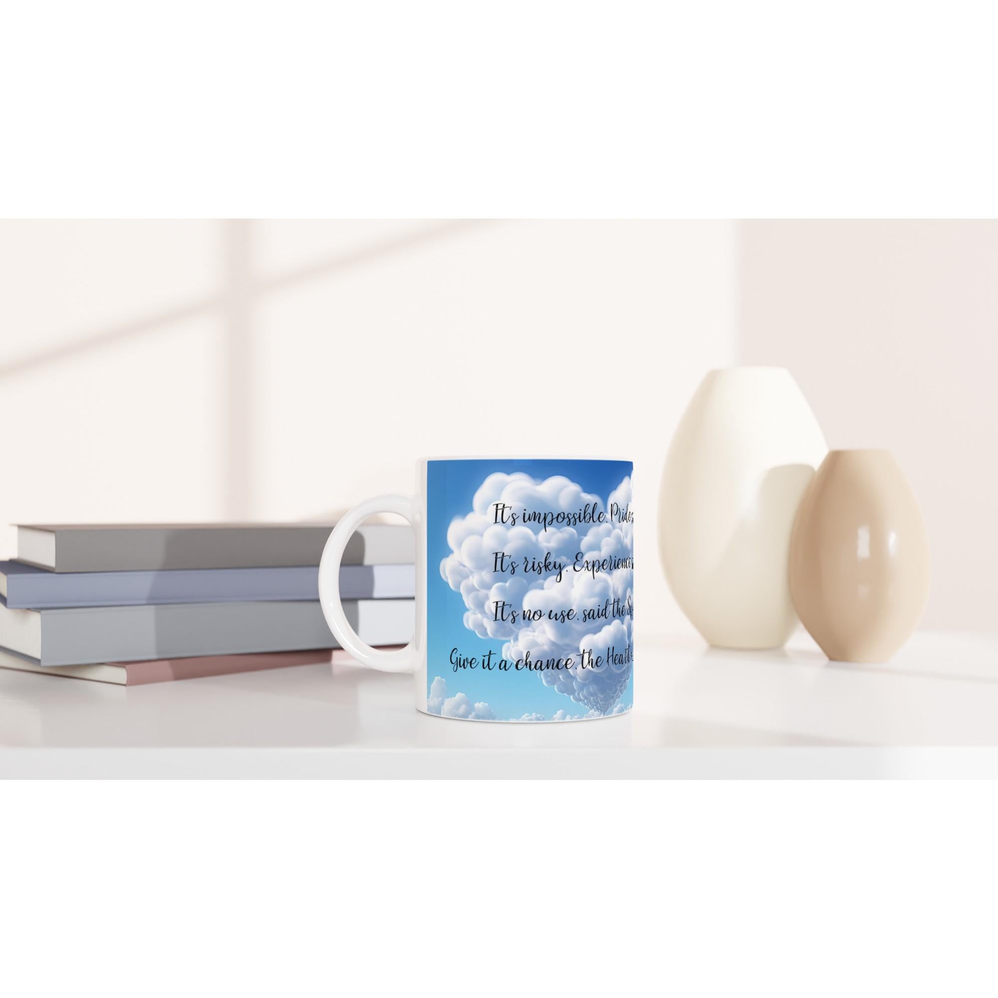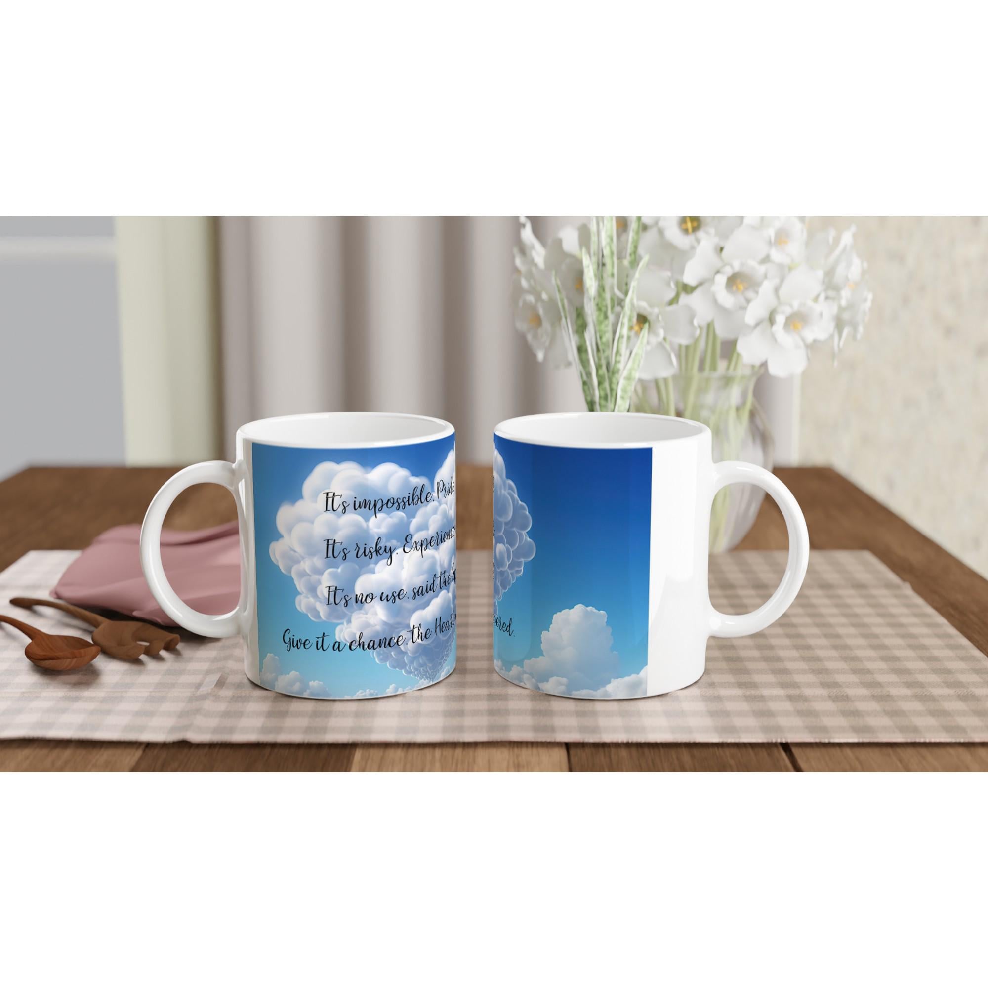 This white 11oz ceramic mug features a beautifully printed motivational quote that reminds you to listen to your heart, even when the world doubts you: