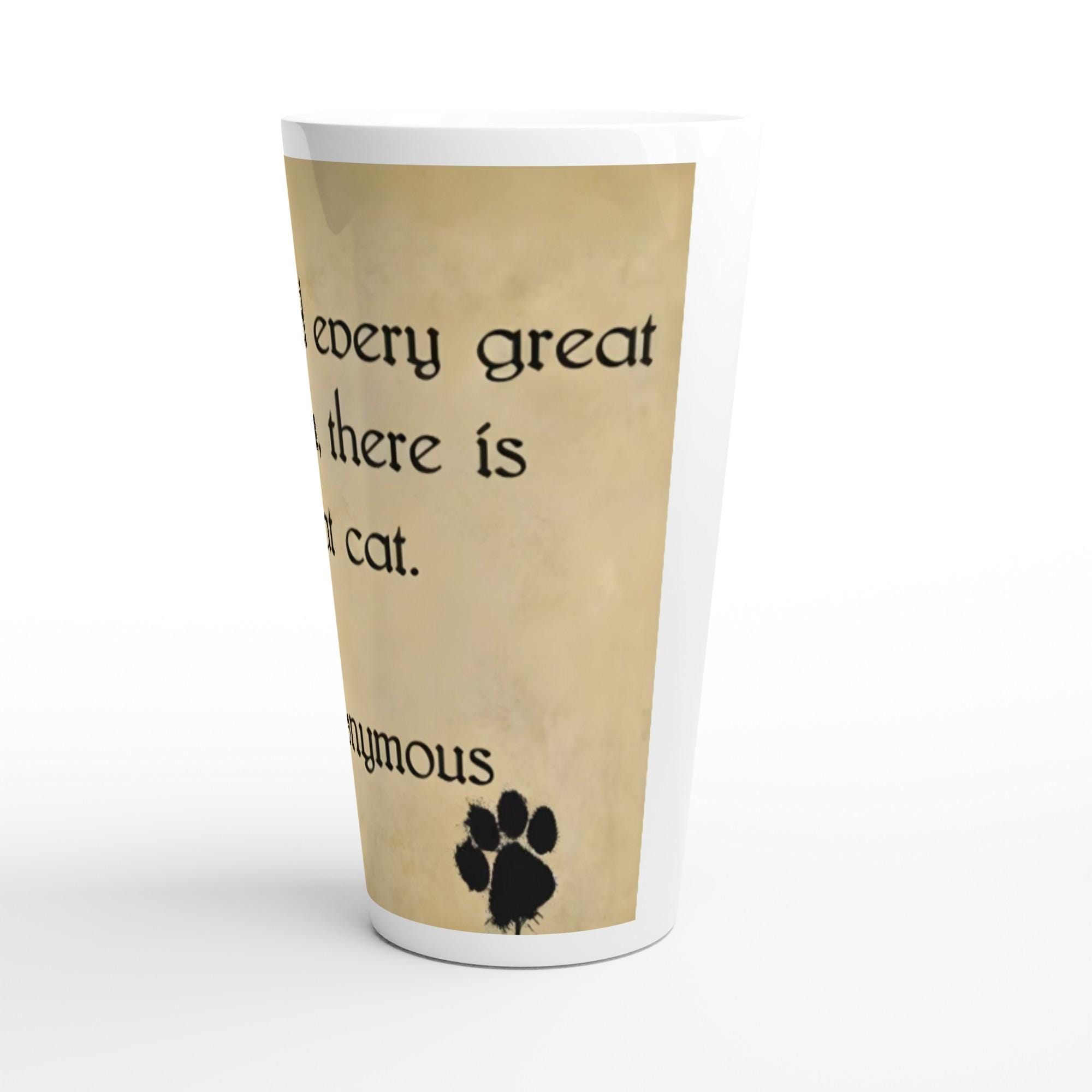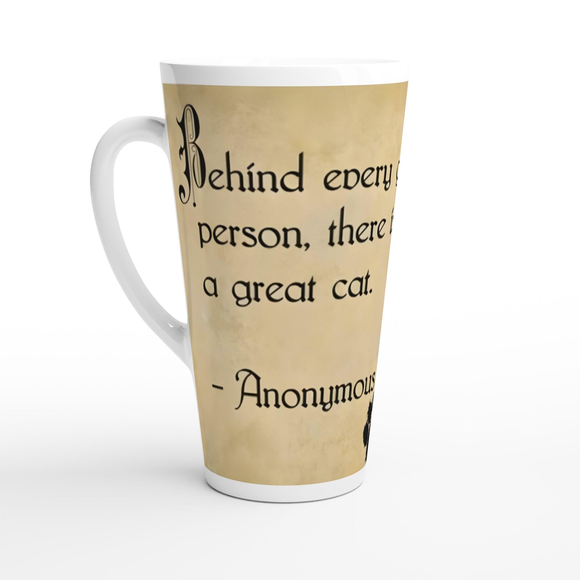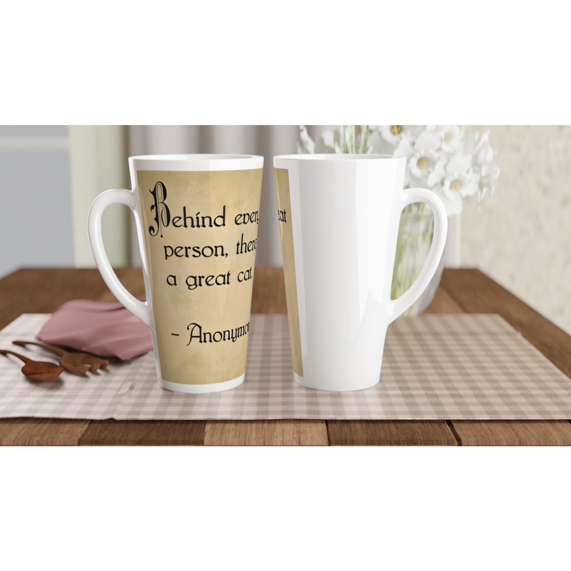 Start your day with a smile and a sip from our delightful latte mug, featuring the whimsical quote, "Behind Every Great Person, There Is a Great Cat," complete with a playful paw print signature. This 17oz ceramic mug is not just a kitchen essential; it’s a cherished companion for your morning coffee, hot chocolate, or tea. Its glossy white finish enhances the vibrant print, ensuring it catches the eye and adds a charming touch to any home or office space.