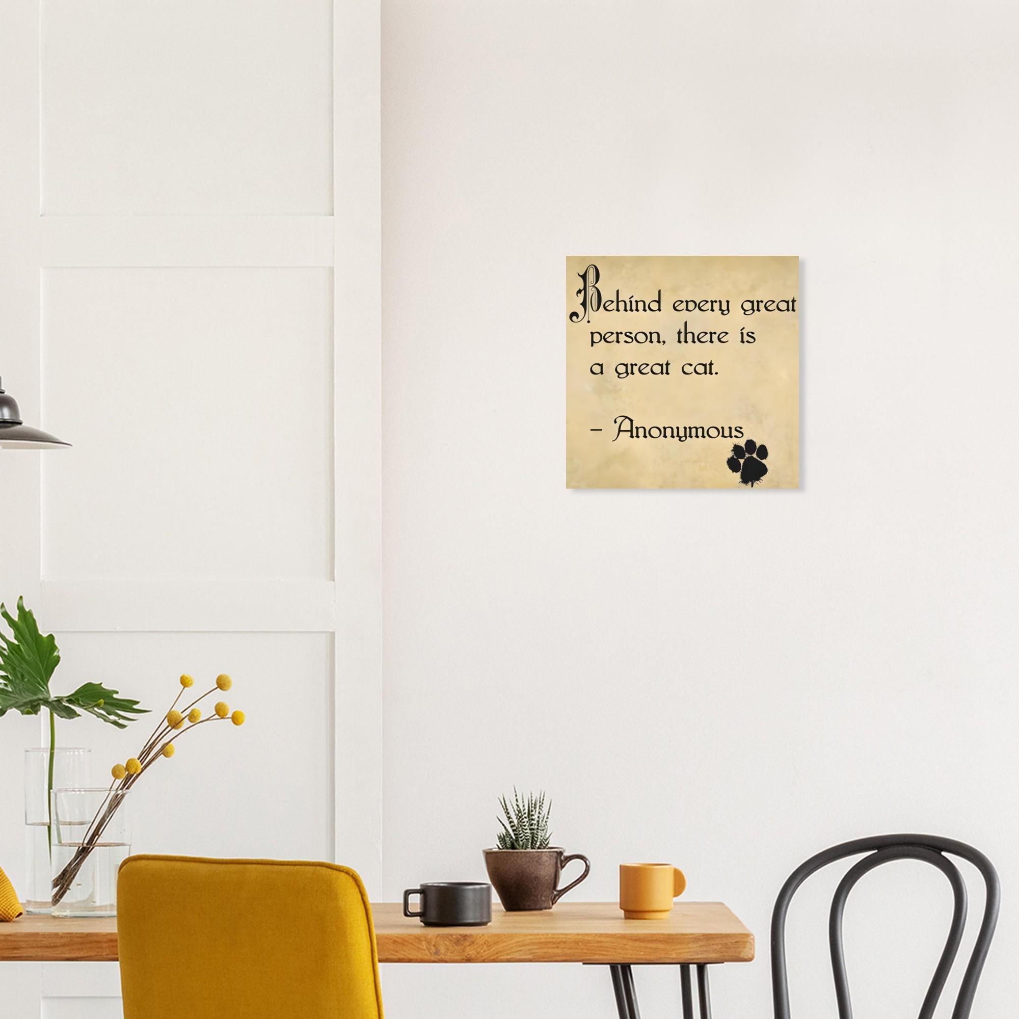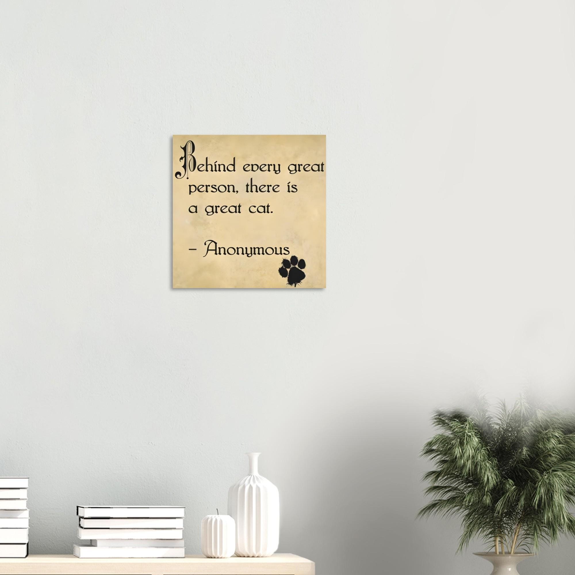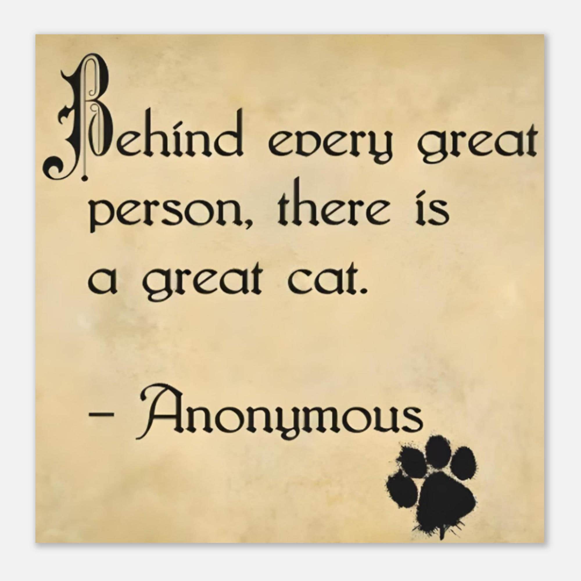 This premium matte paper poster features the whimsical quote “Behind every great person, there’s a great cat” and comes in three different sizes to perfectly fit your wall.