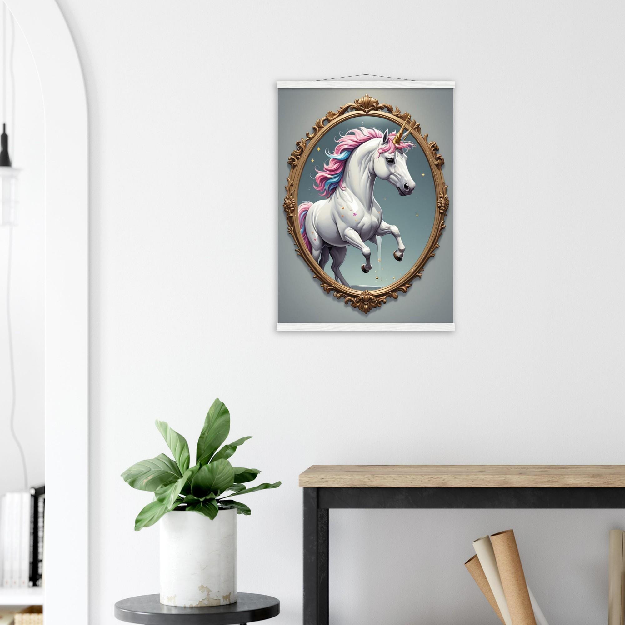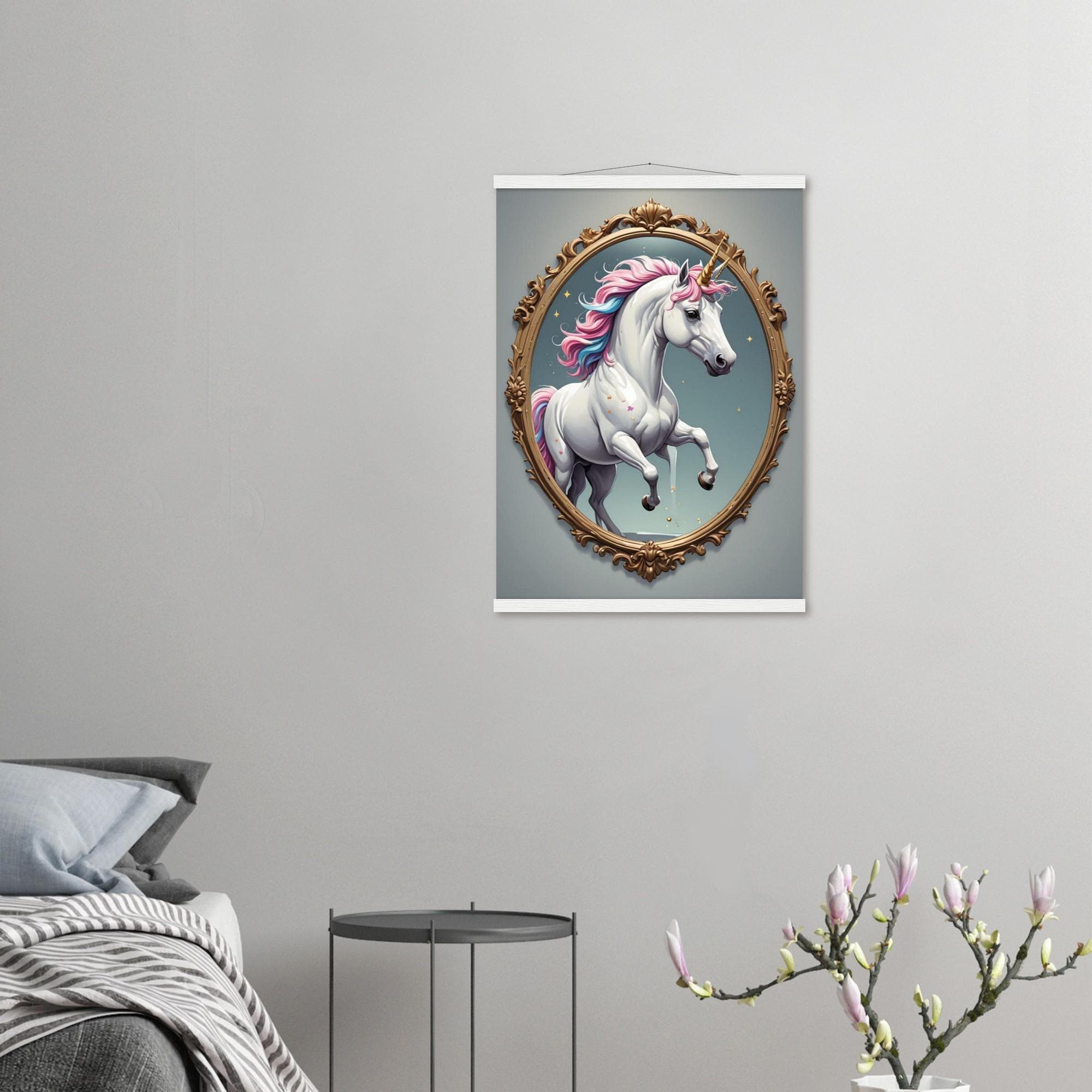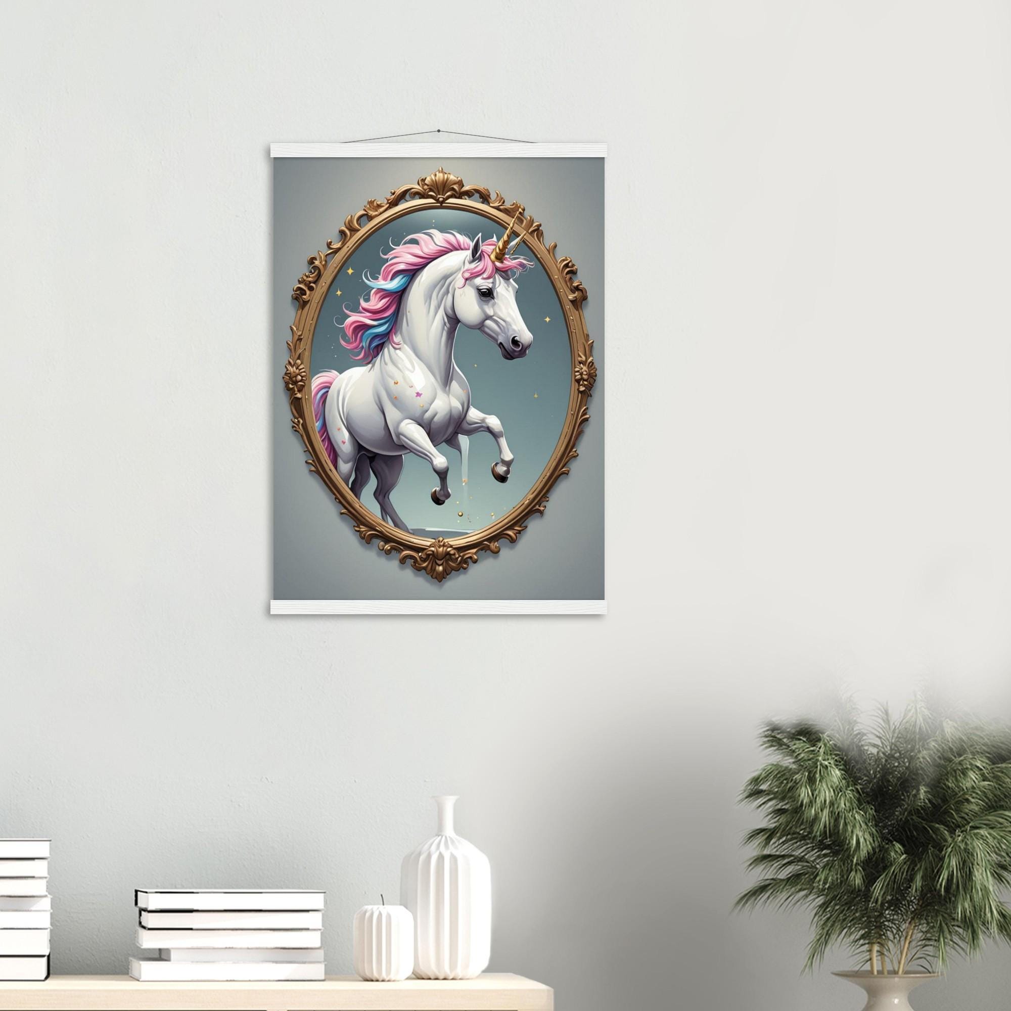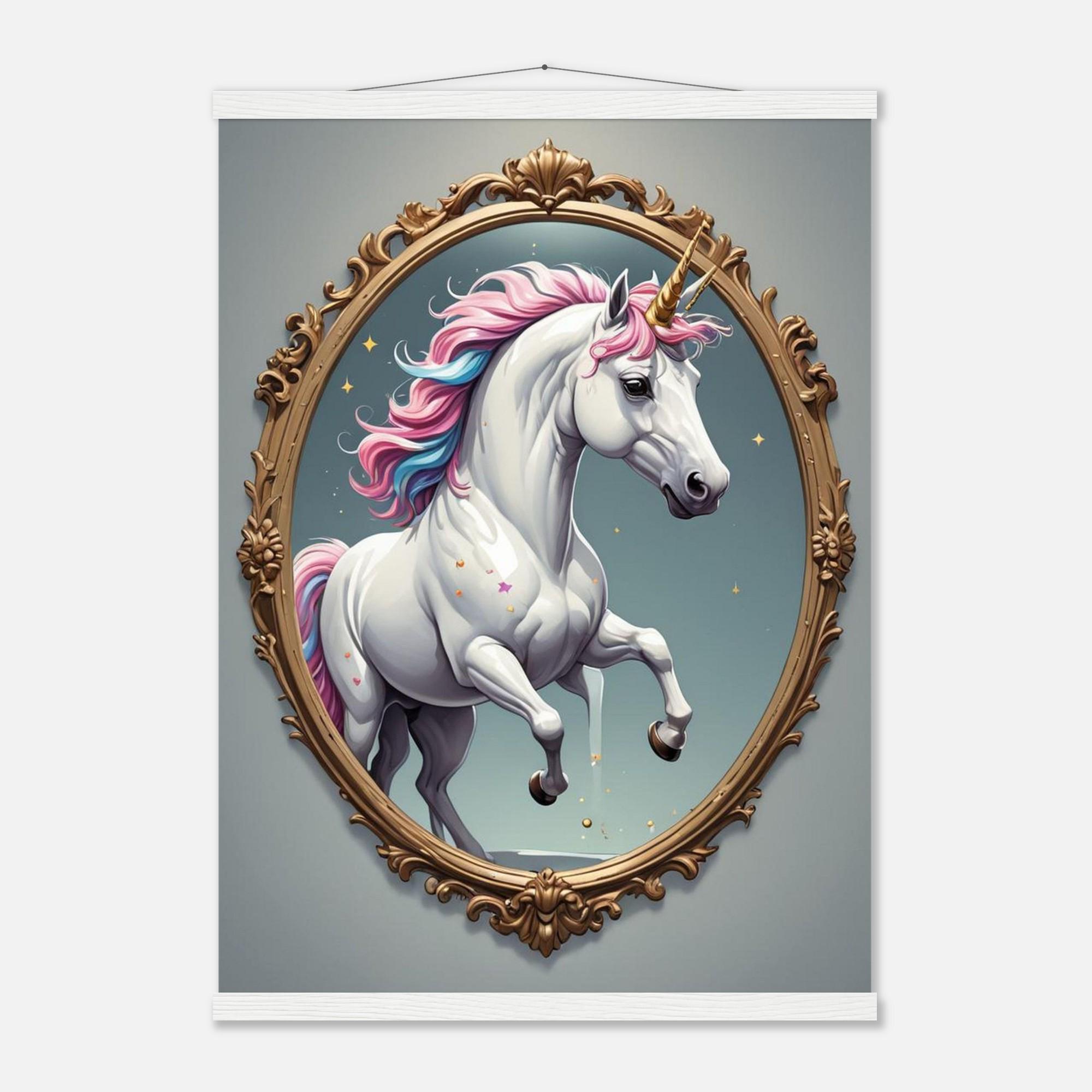 Surrealistic Unicorn Mirror Poster with Light or Dark Wooden Hanger | Dreamy Wall Art for Nursery & Playroom