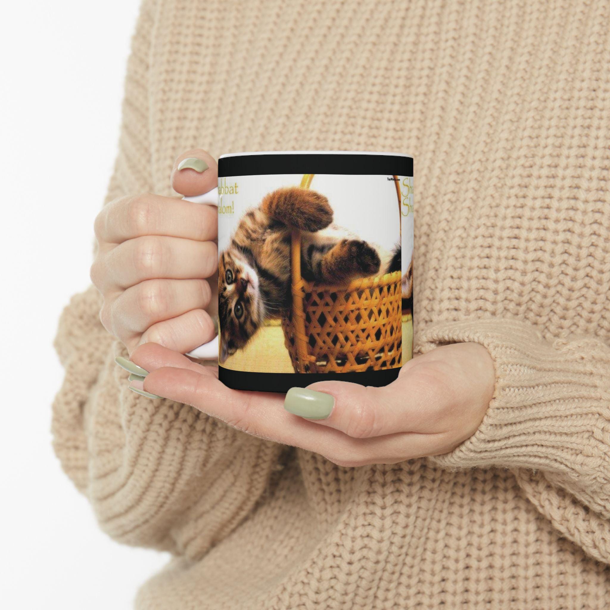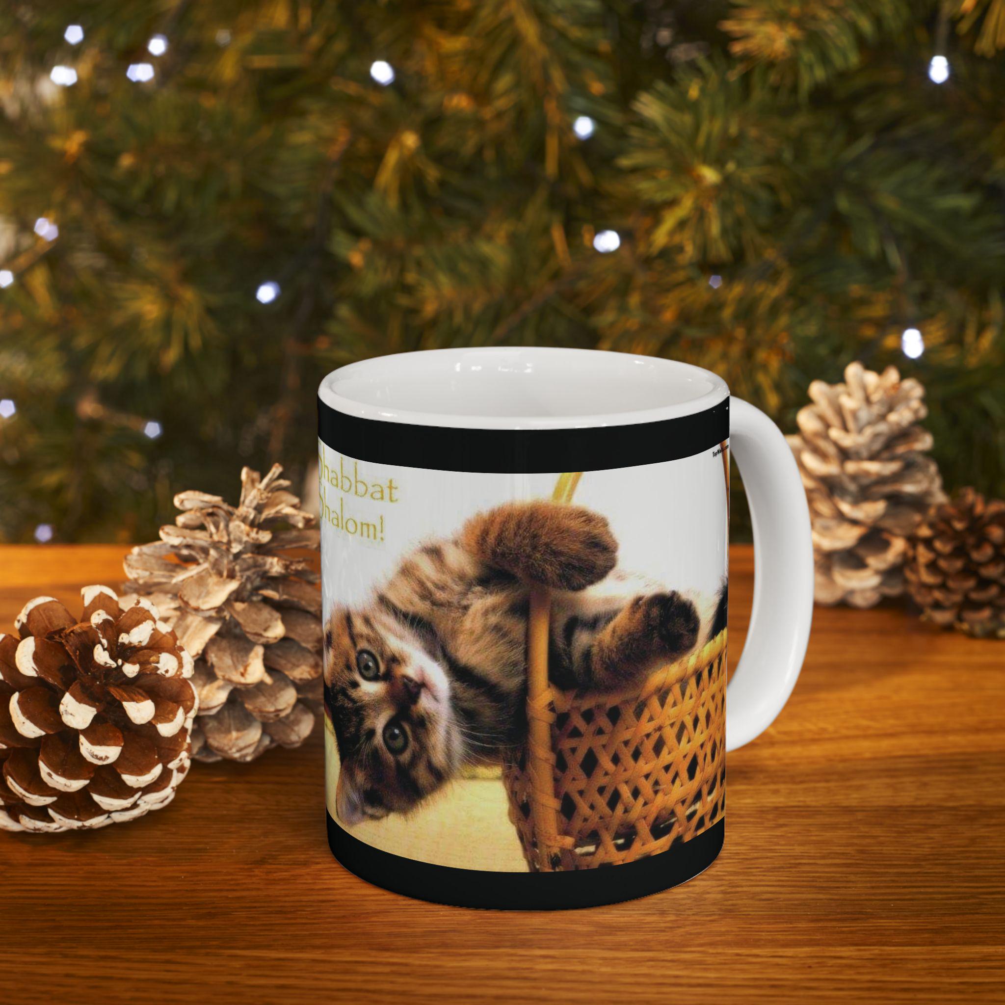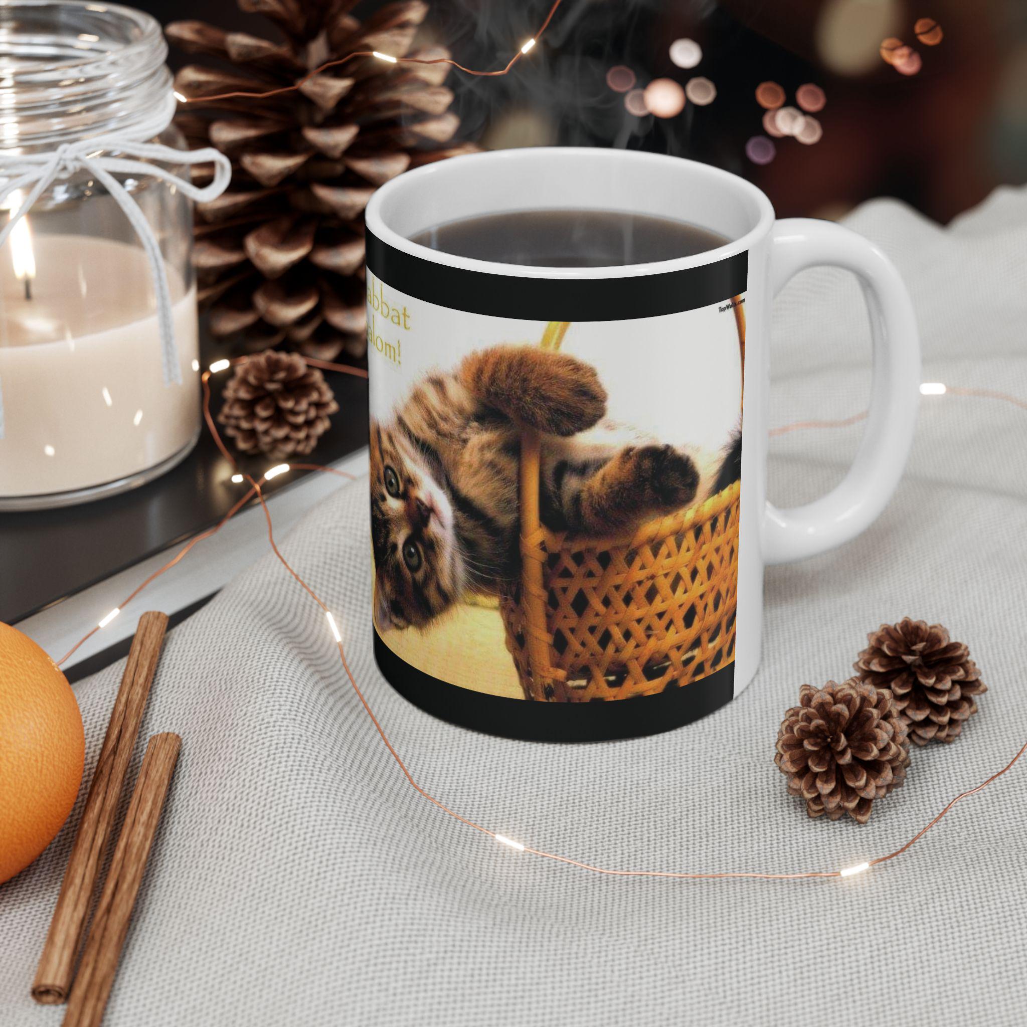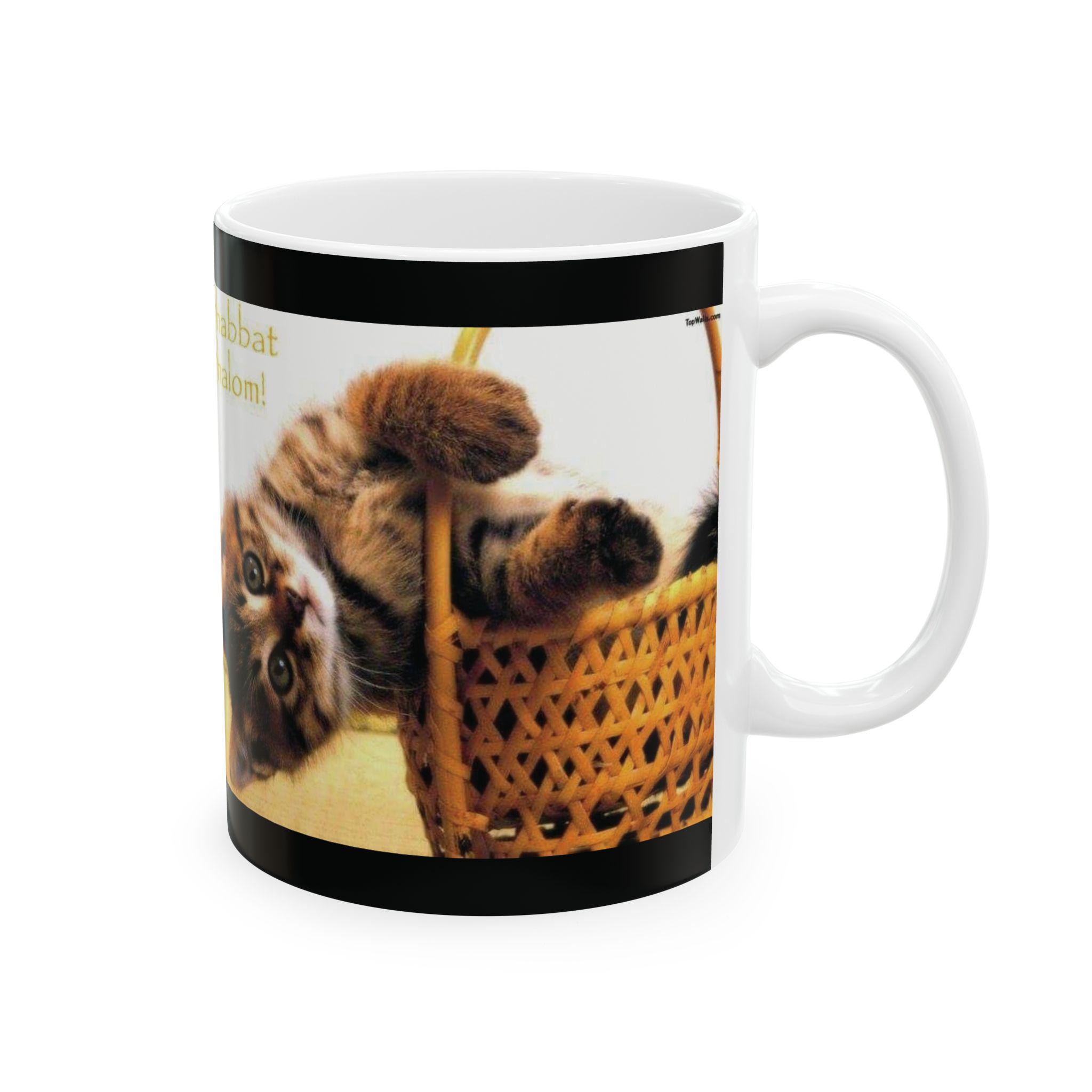 Ceramic Mug, Shabbath Shalom Cat In Basket - Jewish Holiday Gift, Coffee Cup, Tea Mug, Kitchen Decor, Cat Lover Gift, Ceramic Drinkware