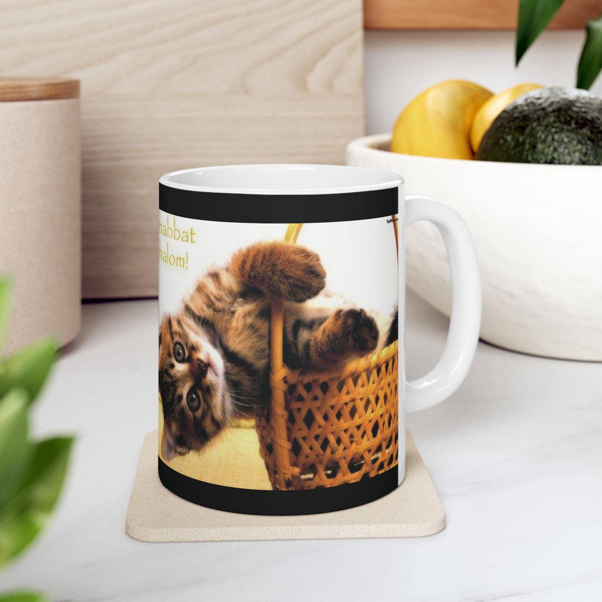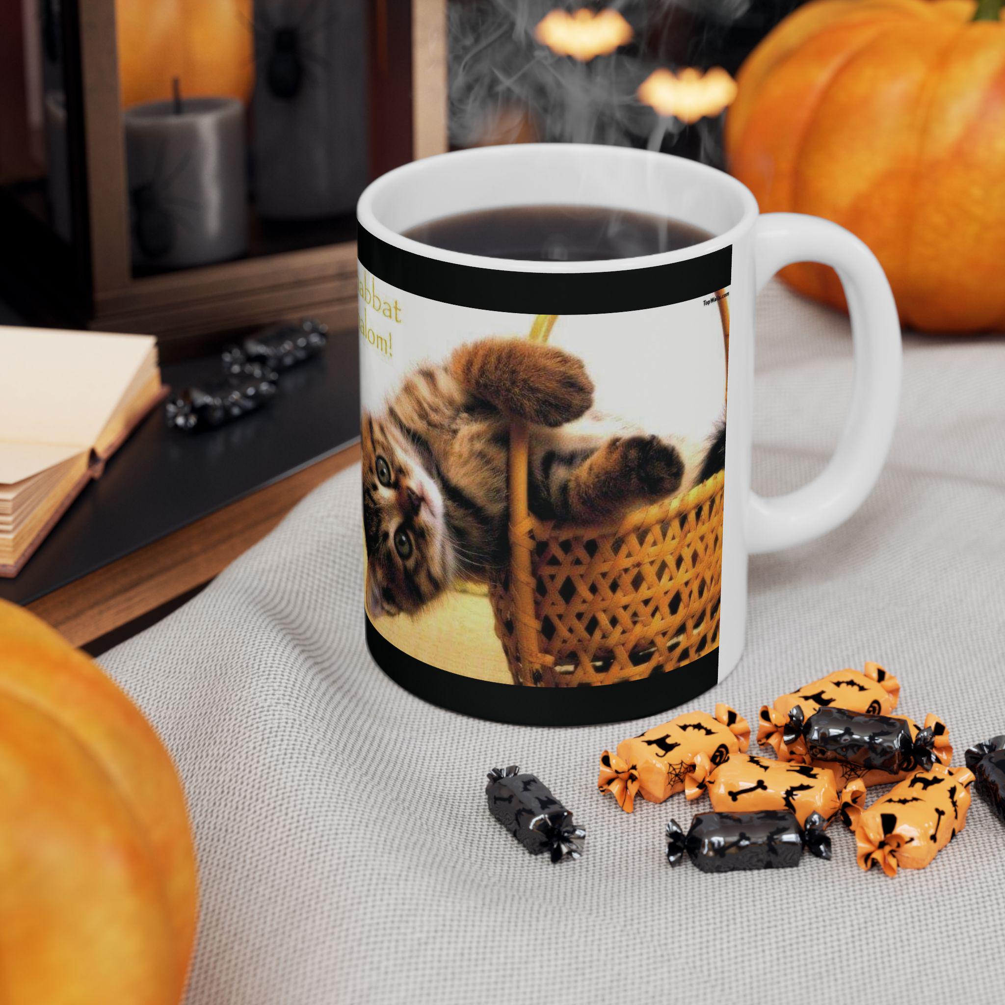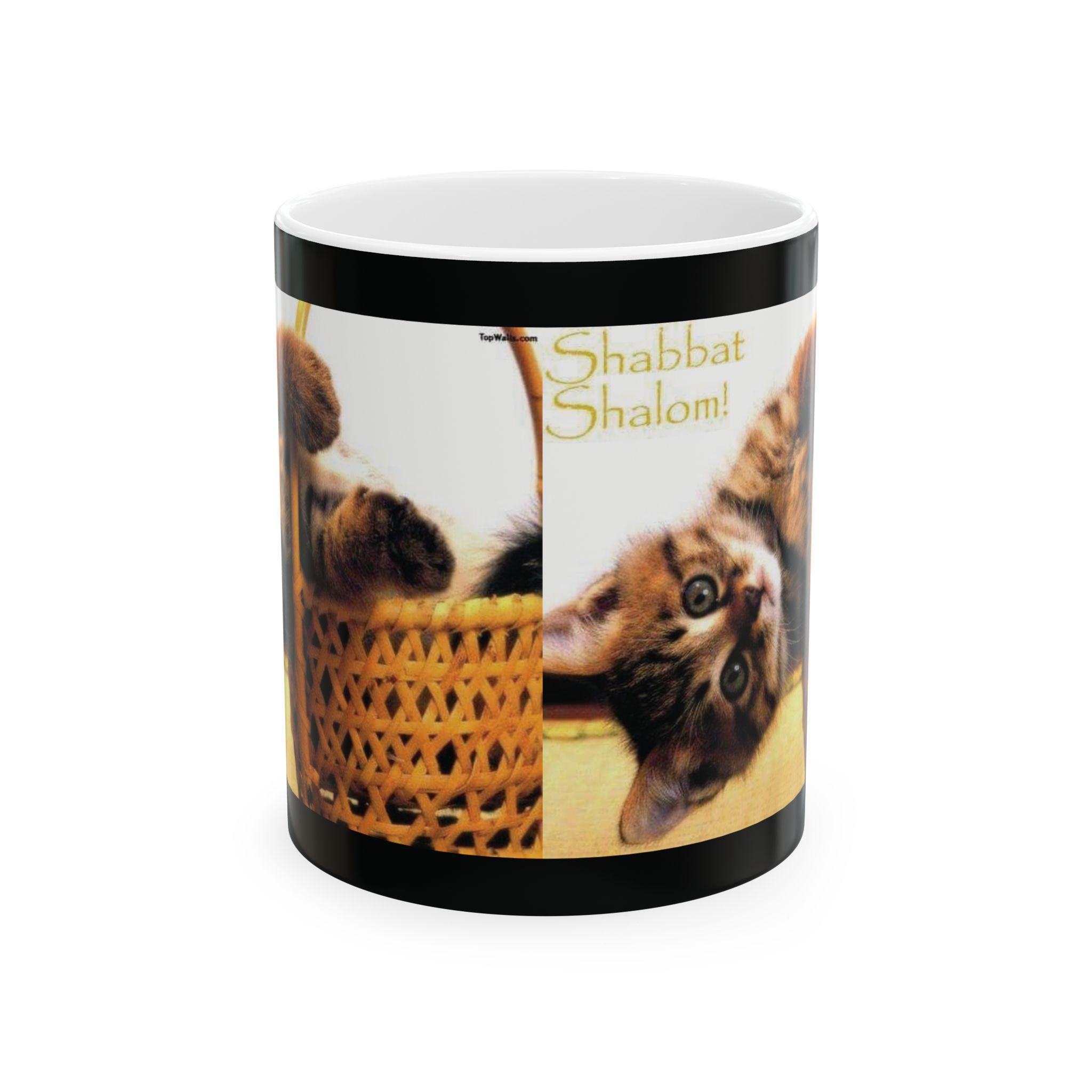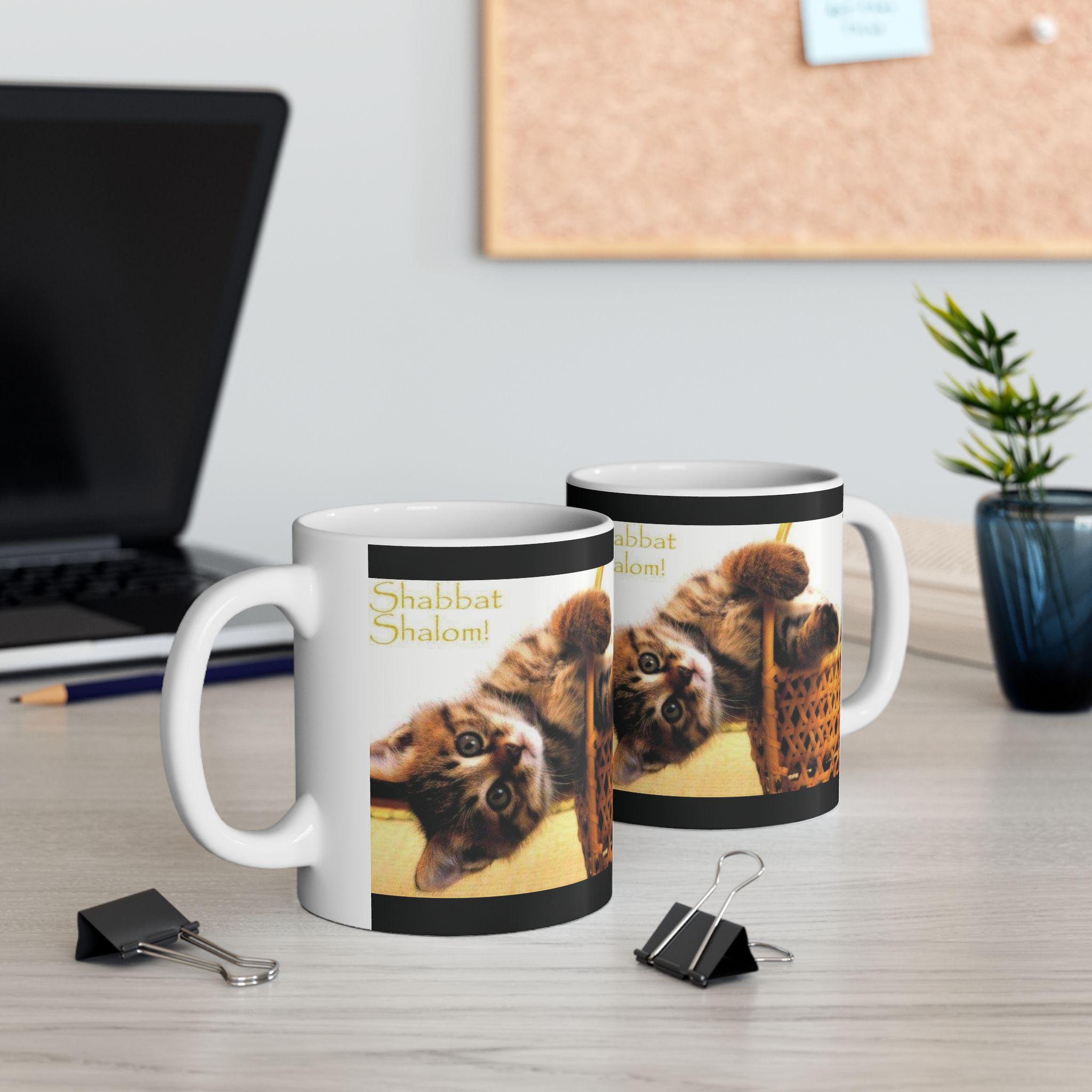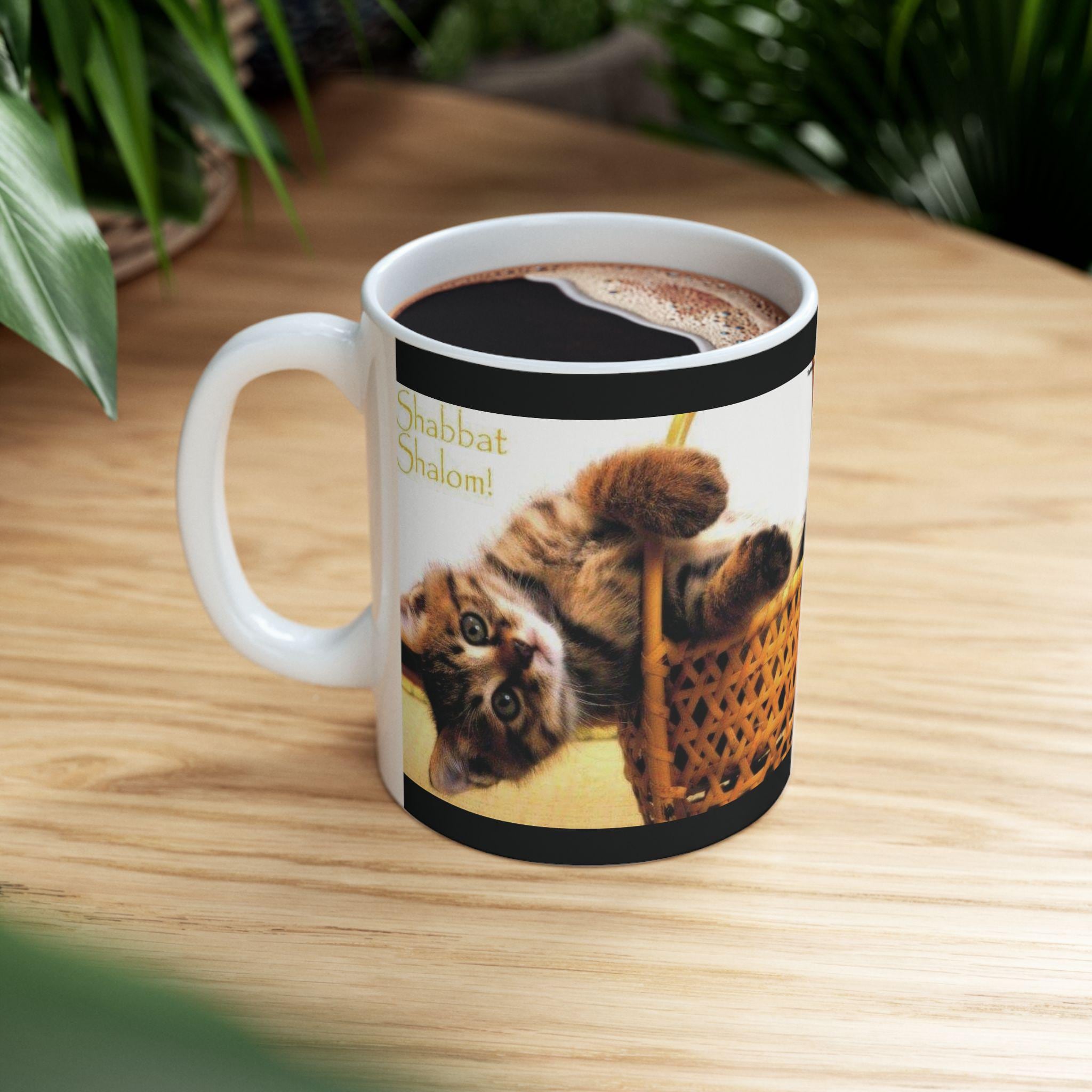 Ceramic Mug, Shabbath Shalom Cat In Basket - Jewish Holiday Gift, Coffee Cup, Tea Mug, Kitchen Decor, Cat Lover Gift, Ceramic Drinkware