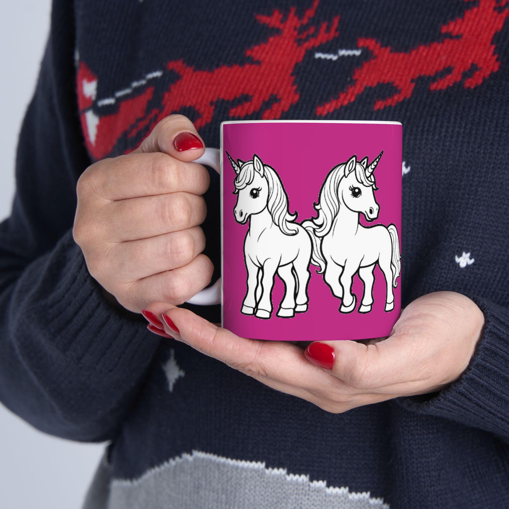 Brighten your daily routine with this charming ceramic mug featuring two adorable unicorns illustrated in elegant black-and-white line art against a soft pink background. The pastel color adds a warm, cheerful touch, making the mug perfect for anyone who loves magical designs, cute aesthetics, or uplifting kitchen décor.