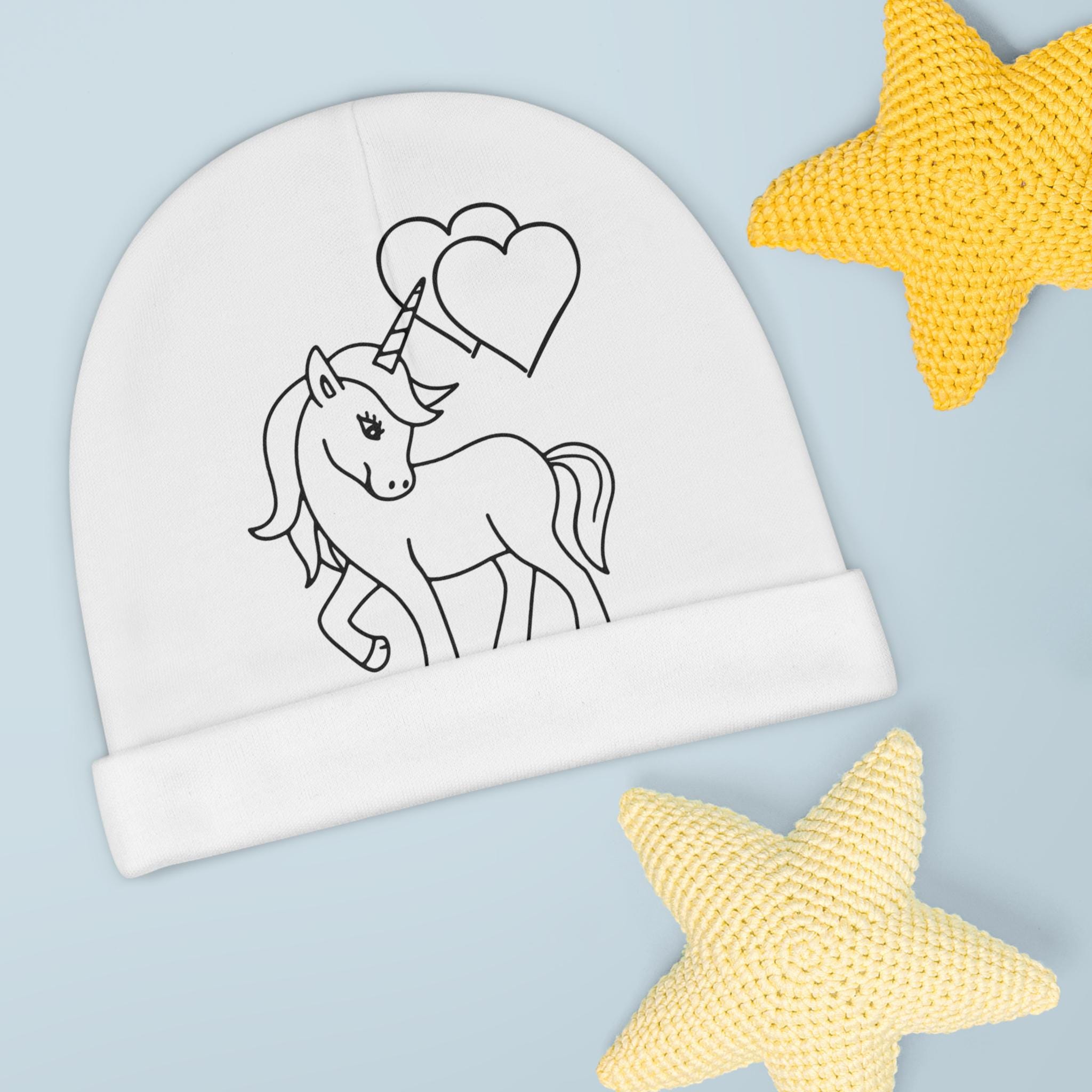 This cute Unicorn Baby Beanie is perfect for keeping your little one warm and stylish. Made of 100% Polyester interlock knit, this medium fabric beanie features the same adorable design printed on both sides. Ideal for babies and toddlers, this beanie is a great addition to their winter wardrobe or a cute gift for baby showers and birthdays.