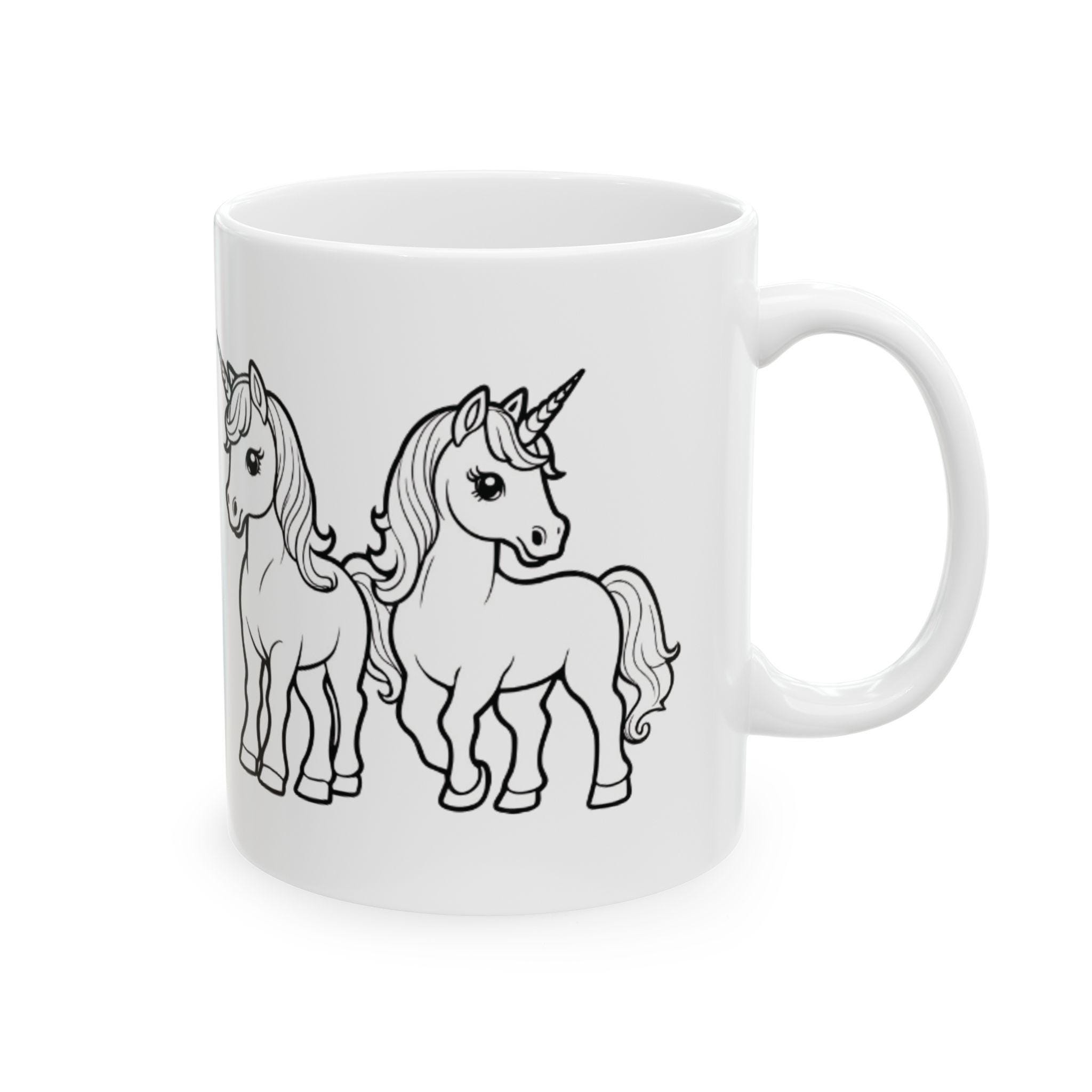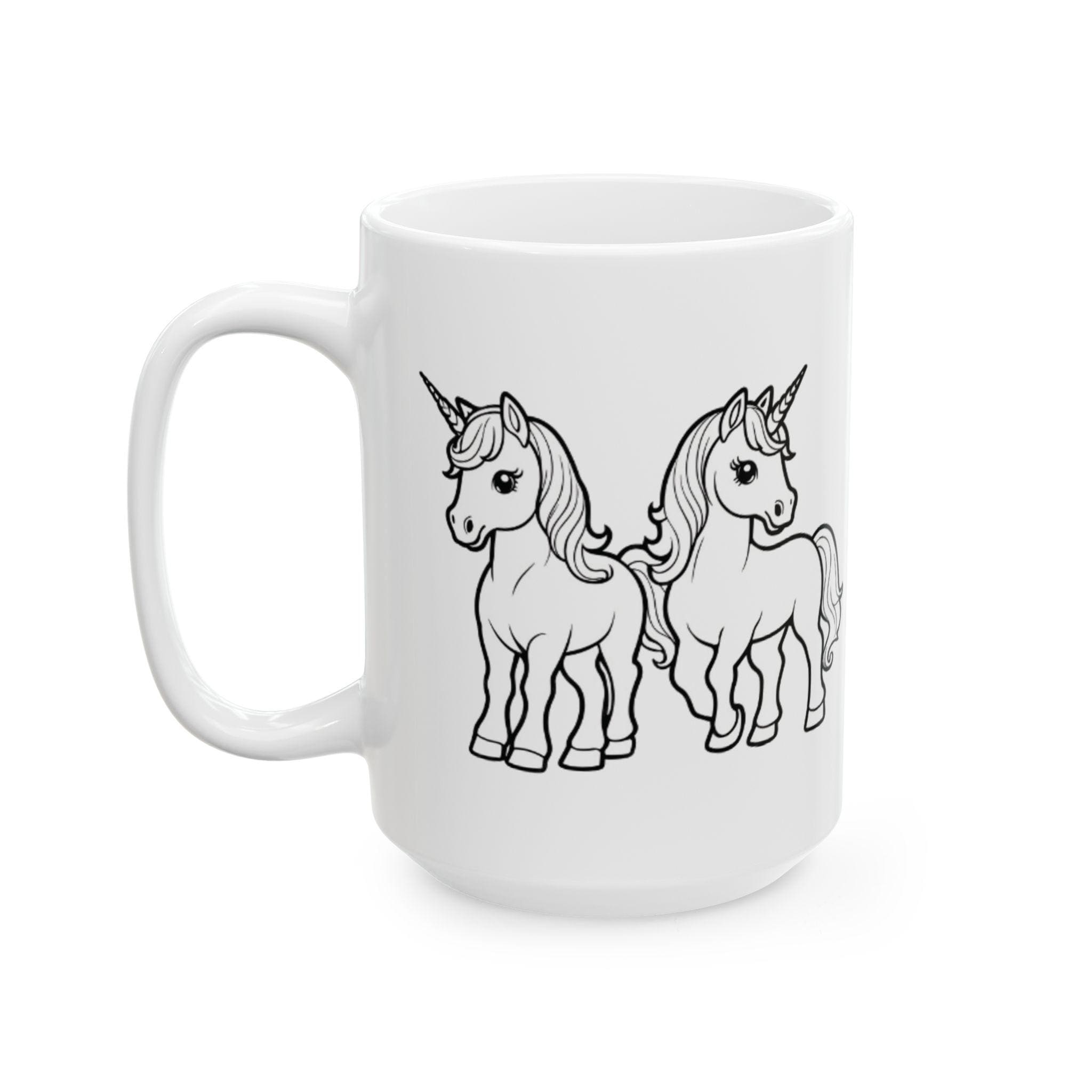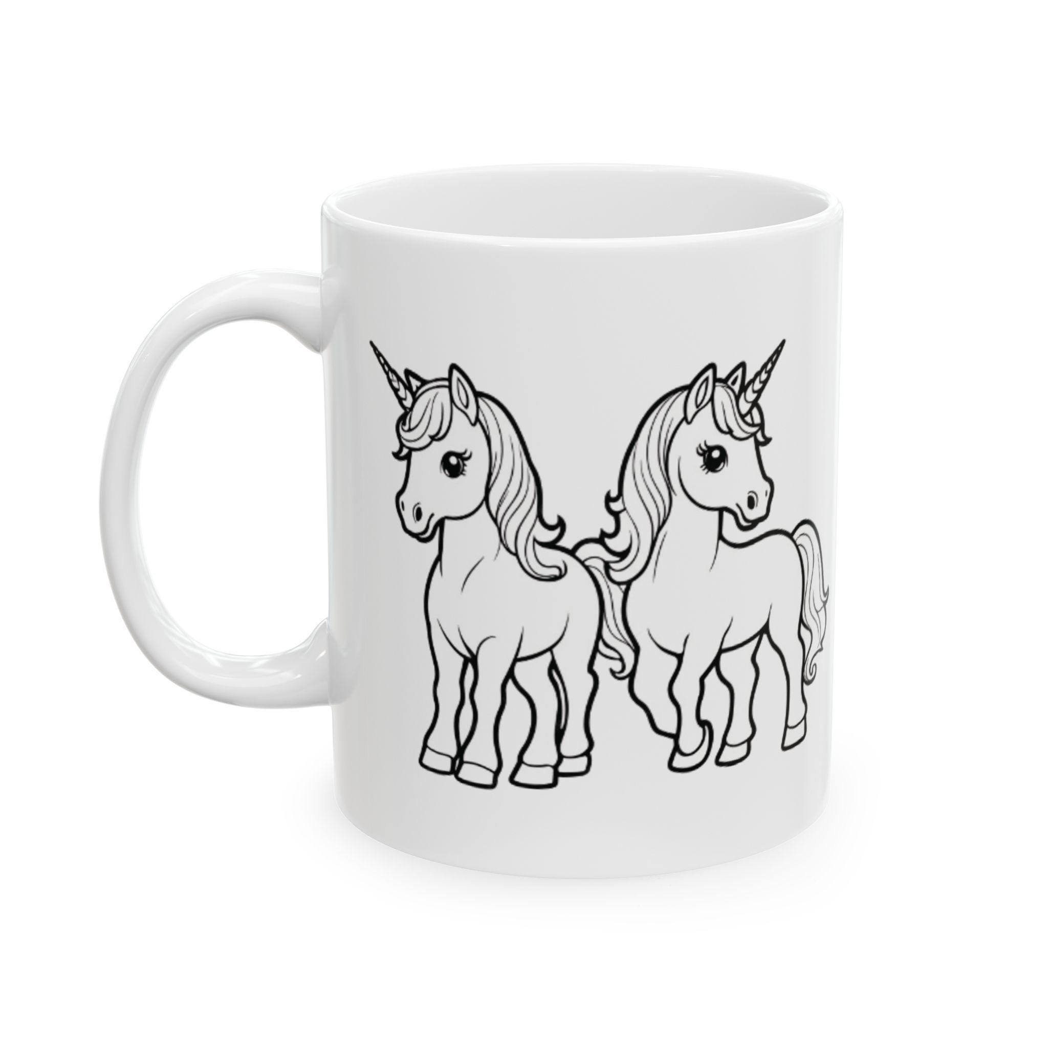 Add a touch of magic to your day with this stylish white ceramic mug featuring two beautifully illustrated unicorns in elegant black-and-white line art. The playful yet minimal design makes it perfect for anyone who loves fantasy, cute illustrations, or a whimsical twist to their daily routine.
