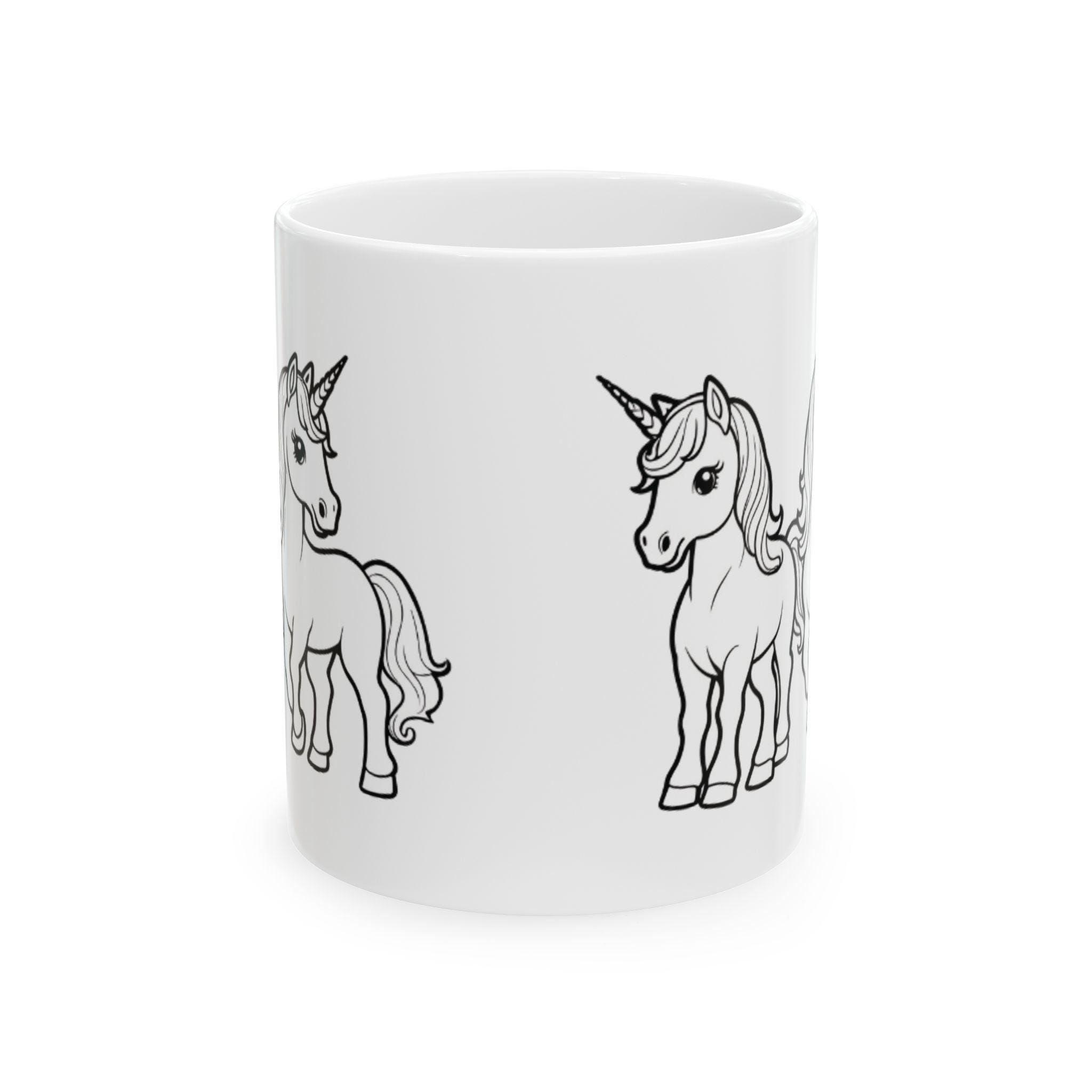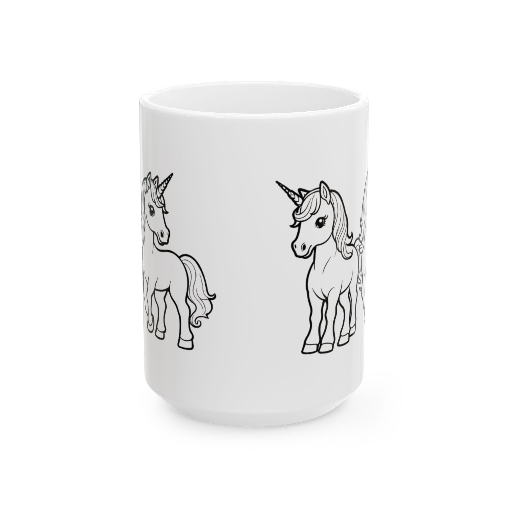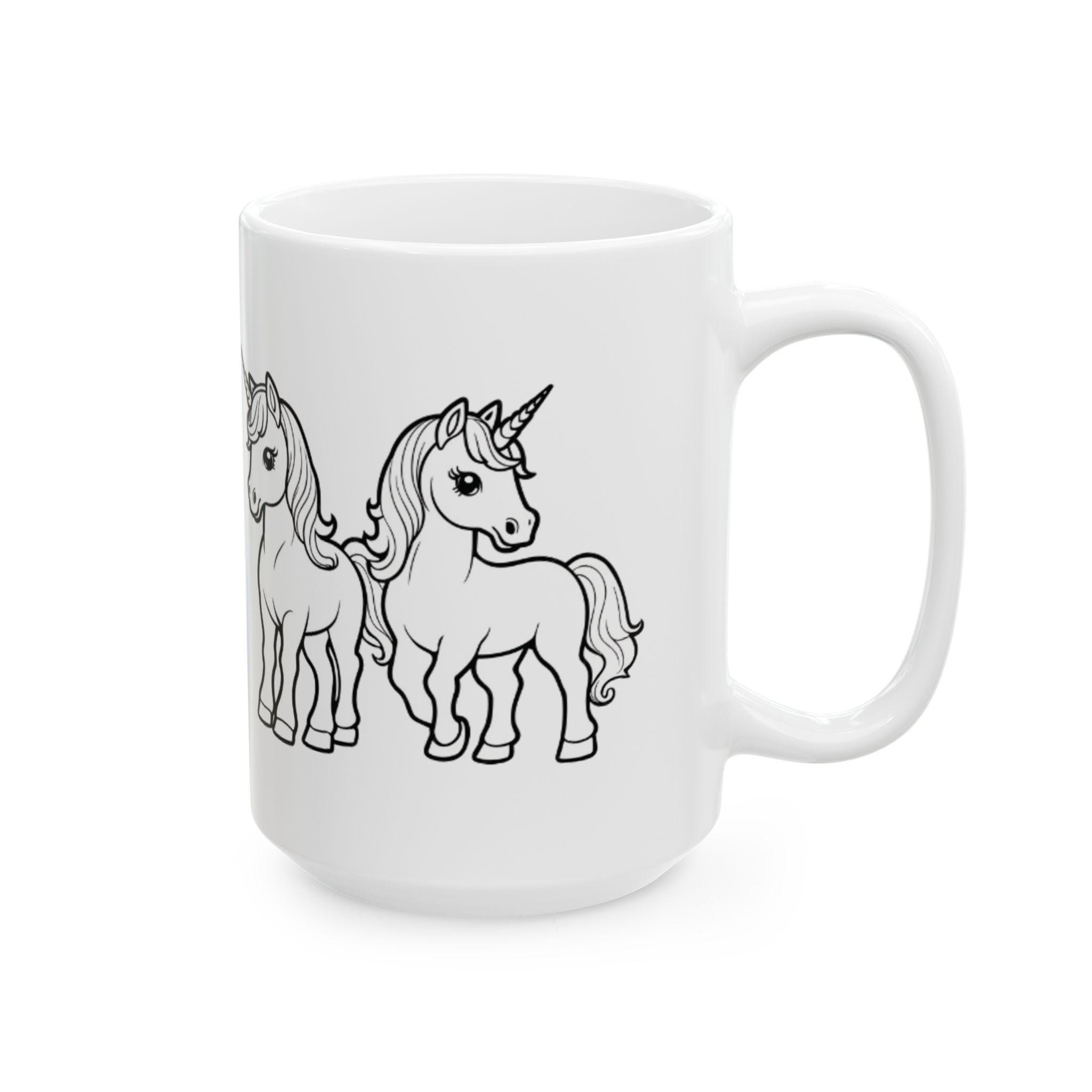 Add a touch of magic to your day with this stylish white ceramic mug featuring two beautifully illustrated unicorns in elegant black-and-white line art. The playful yet minimal design makes it perfect for anyone who loves fantasy, cute illustrations, or a whimsical twist to their daily routine.