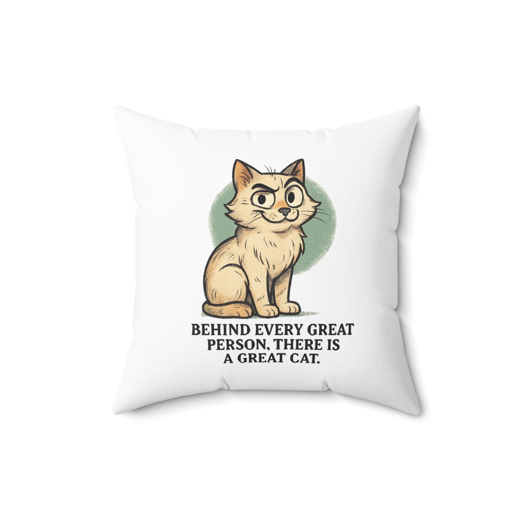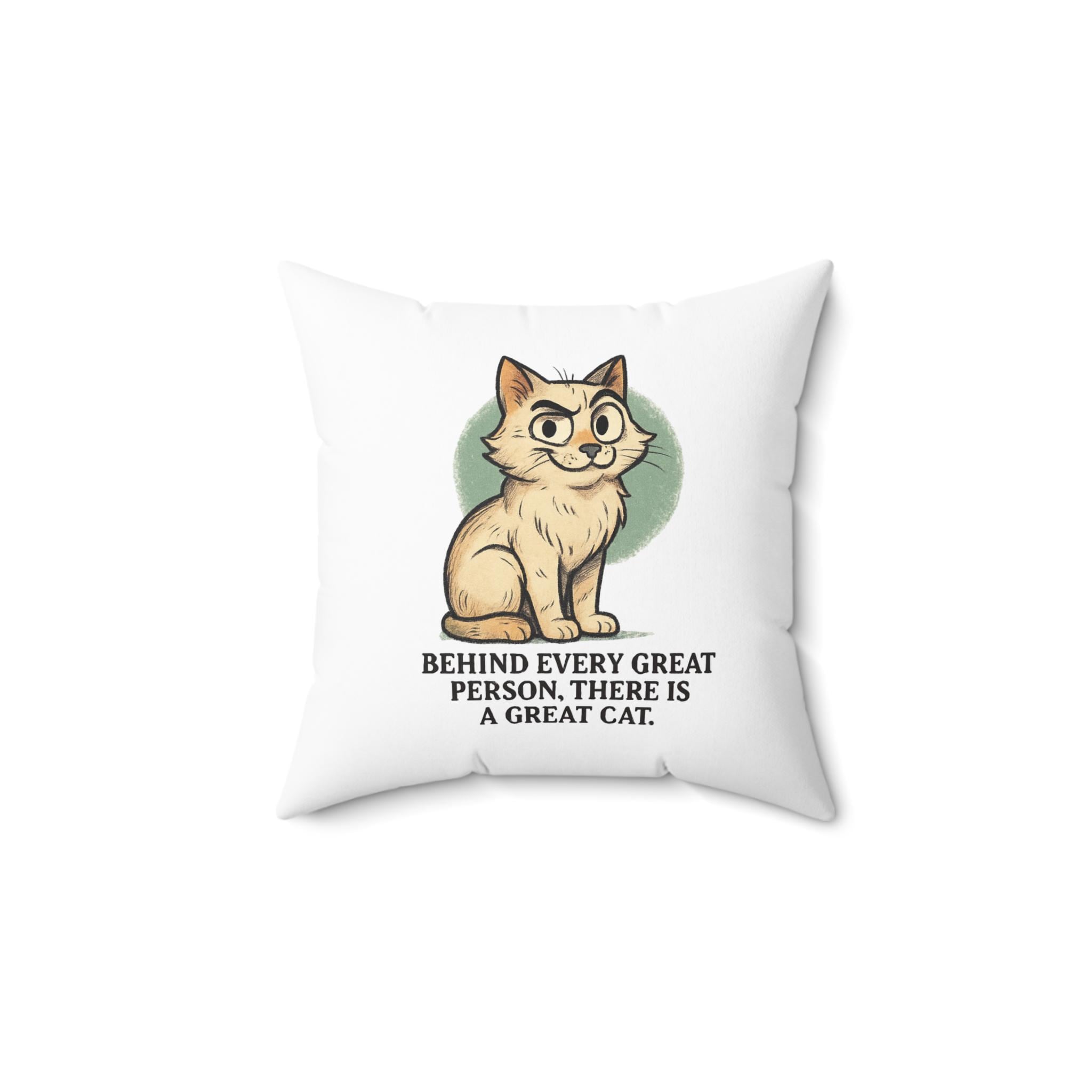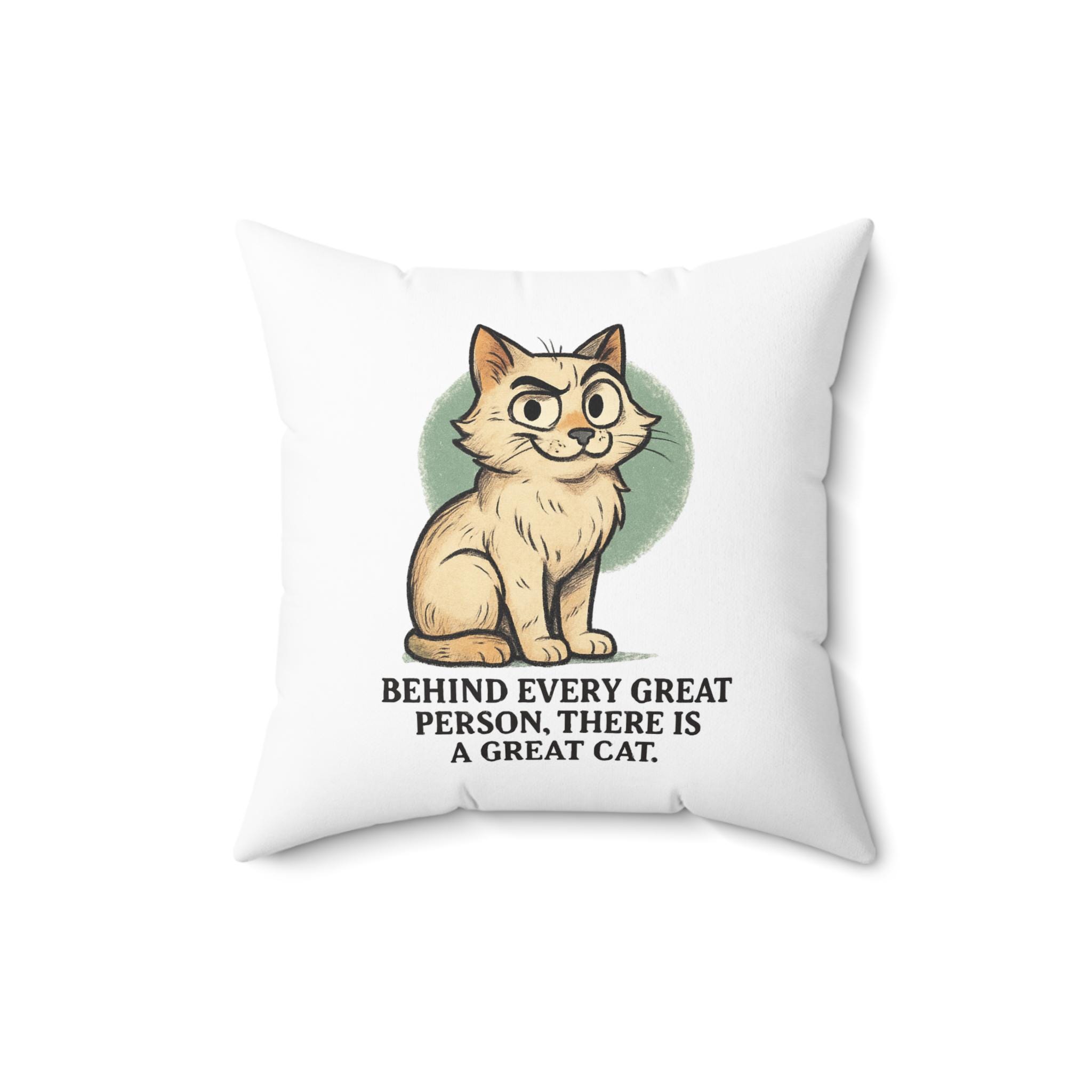 Add a touch of whimsy and warmth to your space with this delightful pillow. Perfect for cat lovers, this fun design features a charming illustration with the quote, "Behind every great person, there is a great cat." It's an ideal accent for your living room, bedroom, or cat-themed nook, making it a conversation starter that brings smiles to your home. This pillow offers comfort and style, complementing any decor while reflecting your love for cats. It’s great for housewarmings, birthdays, or any occasion celebrating feline companions, adding a playful vibe to any celebration or everyday relaxation.