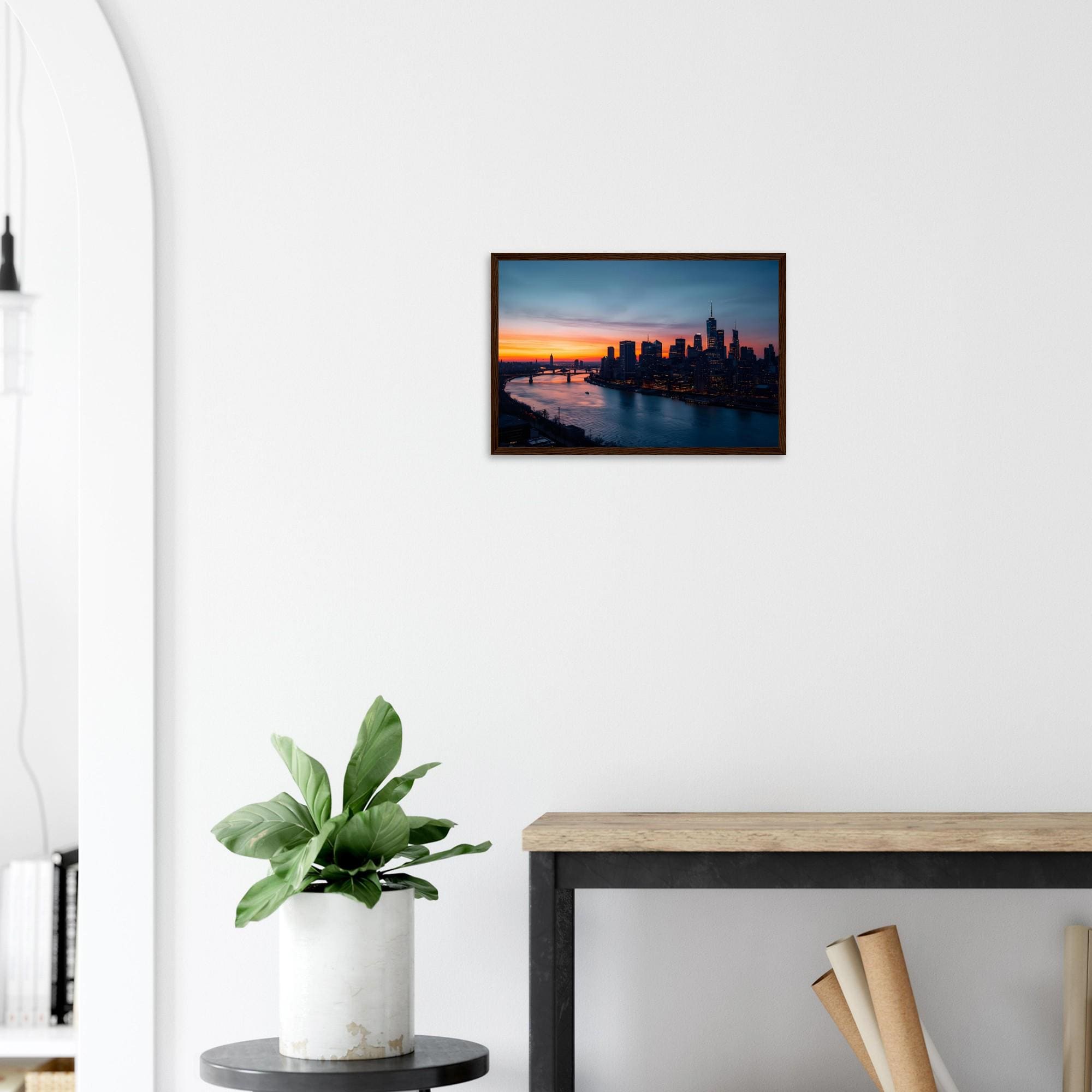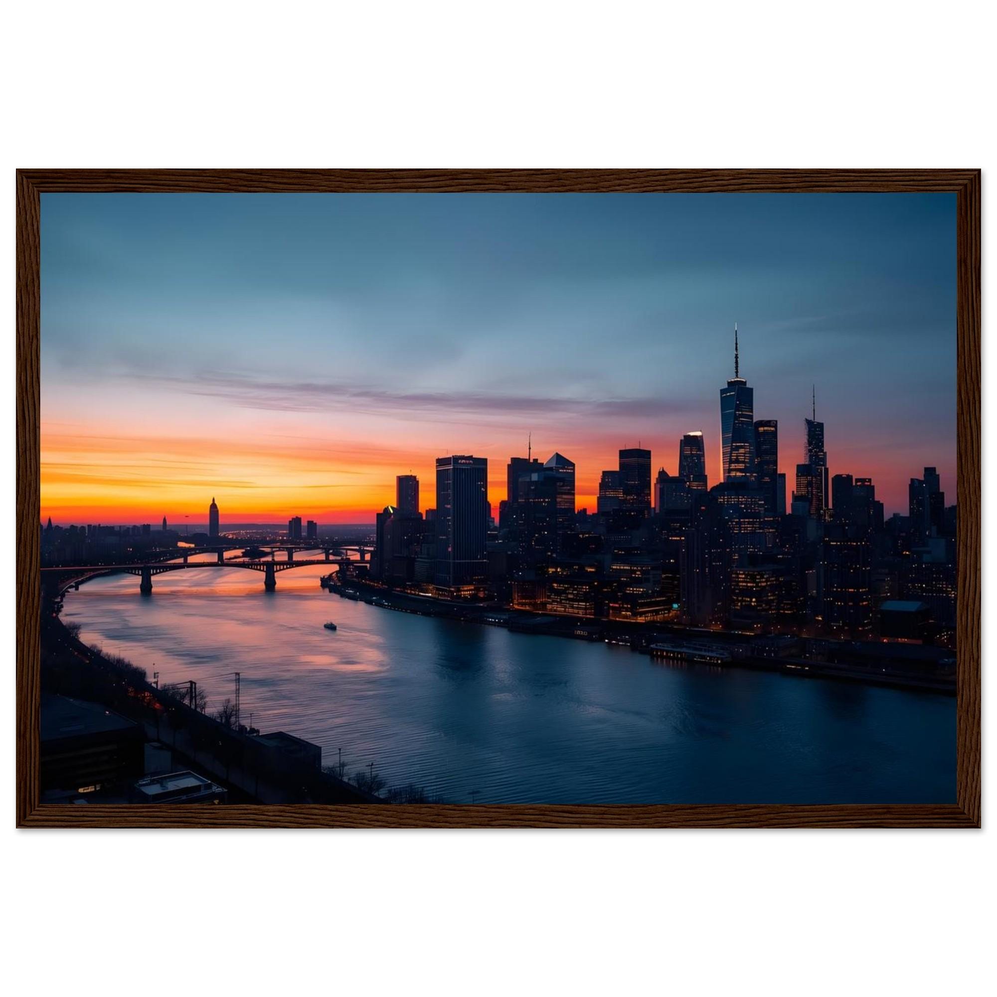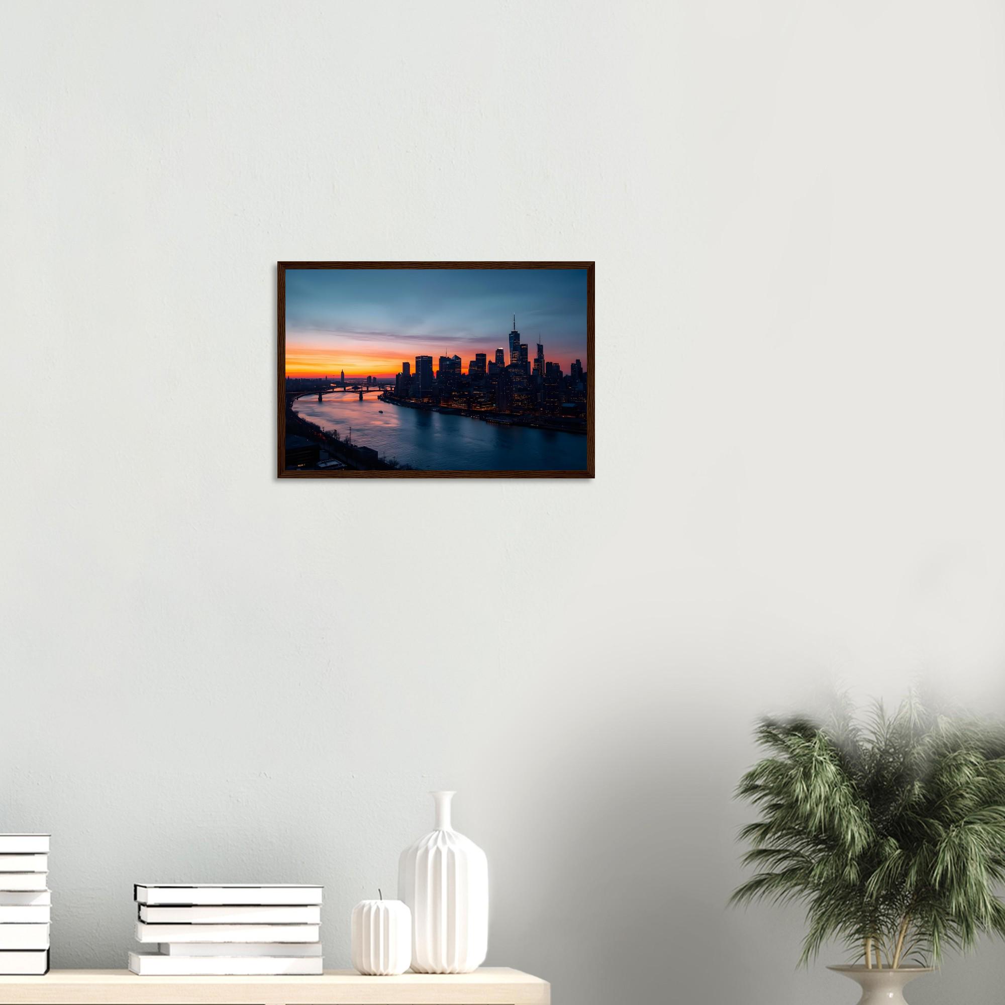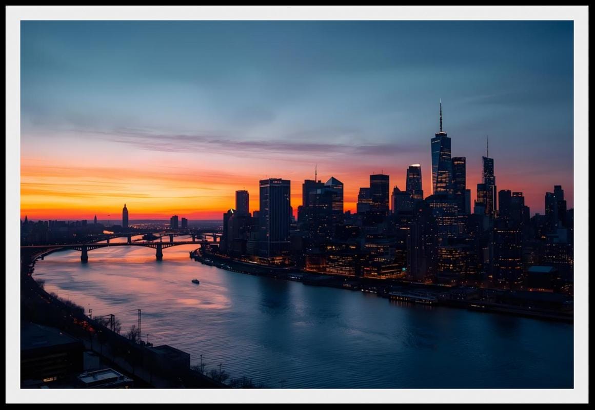 Transform your space with our breathtaking Brooklyn Bridge Framed Poster, capturing a stunning city skyline at dusk. This artwork features a glorious sunset with warm, glowing lights from nearby buildings reflecting beautifully on a calm river below. As the vibrant orange and pink hues near the horizon seamlessly transition to deep indigo overhead, the silhouetted skyscrapers create a dramatic contrast that will mesmerize anyone who sees it.