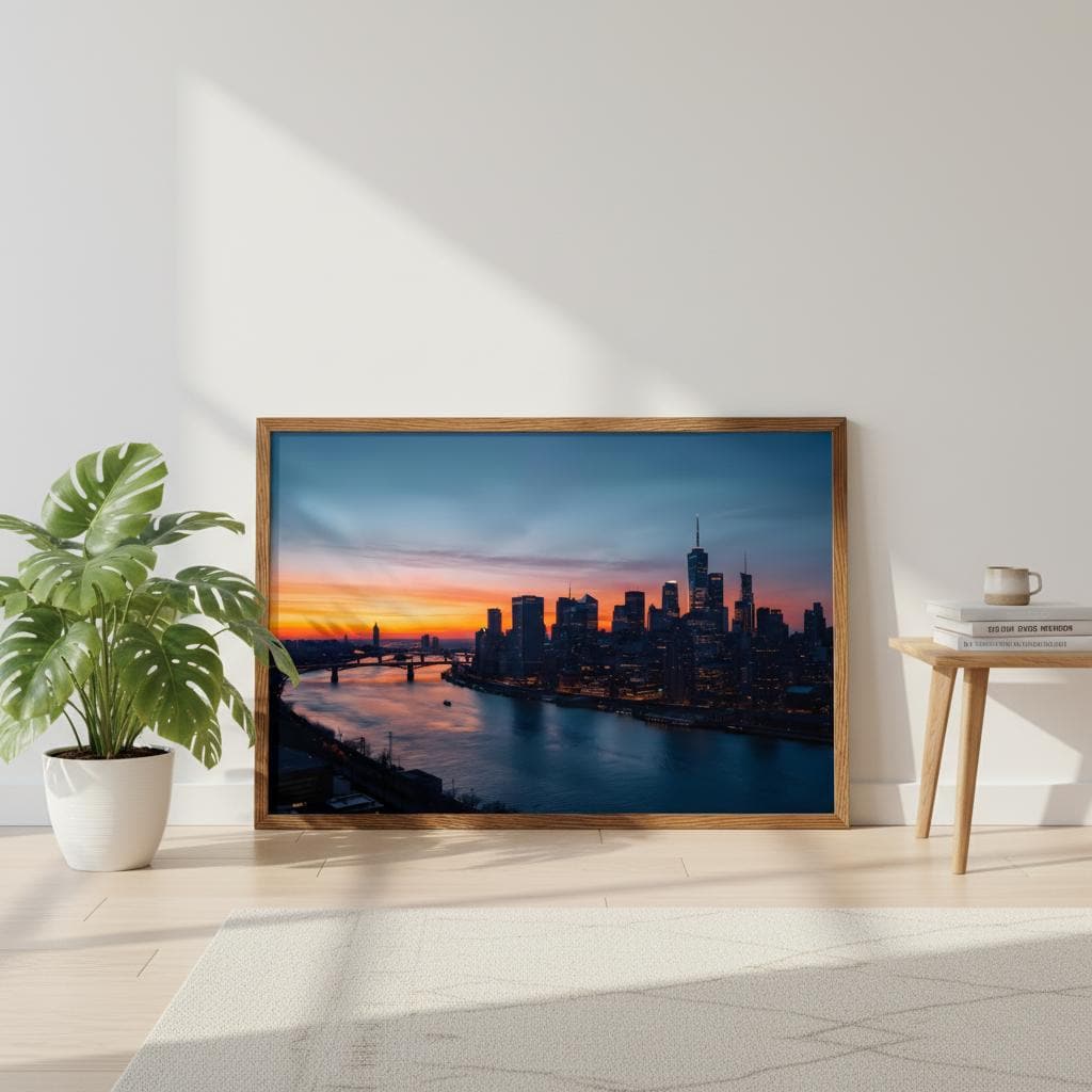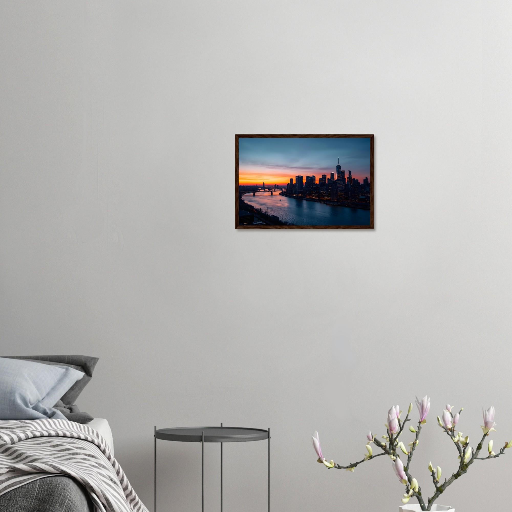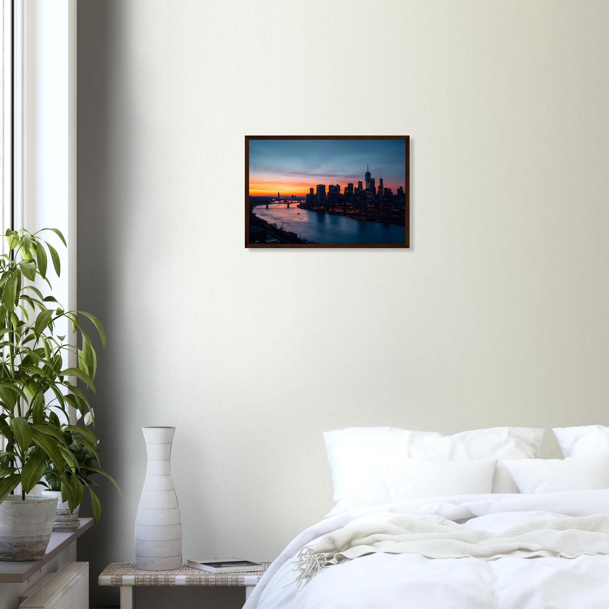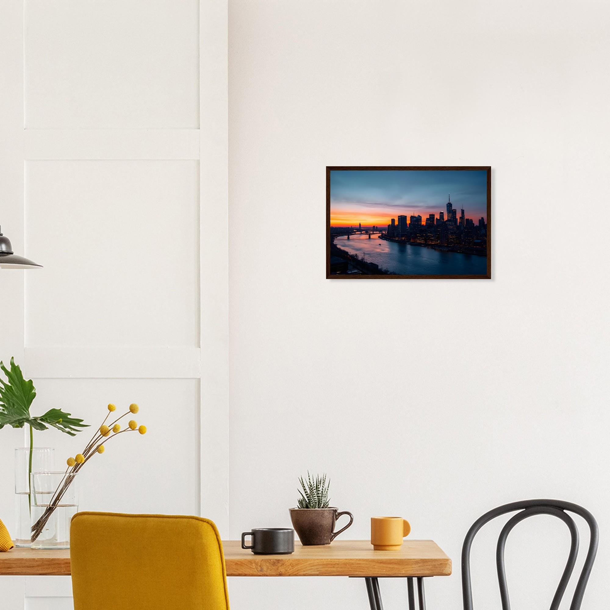 Transform your space with our breathtaking Brooklyn Bridge Framed Poster, capturing a stunning city skyline at dusk. This artwork features a glorious sunset with warm, glowing lights from nearby buildings reflecting beautifully on a calm river below. As the vibrant orange and pink hues near the horizon seamlessly transition to deep indigo overhead, the silhouetted skyscrapers create a dramatic contrast that will mesmerize anyone who sees it.