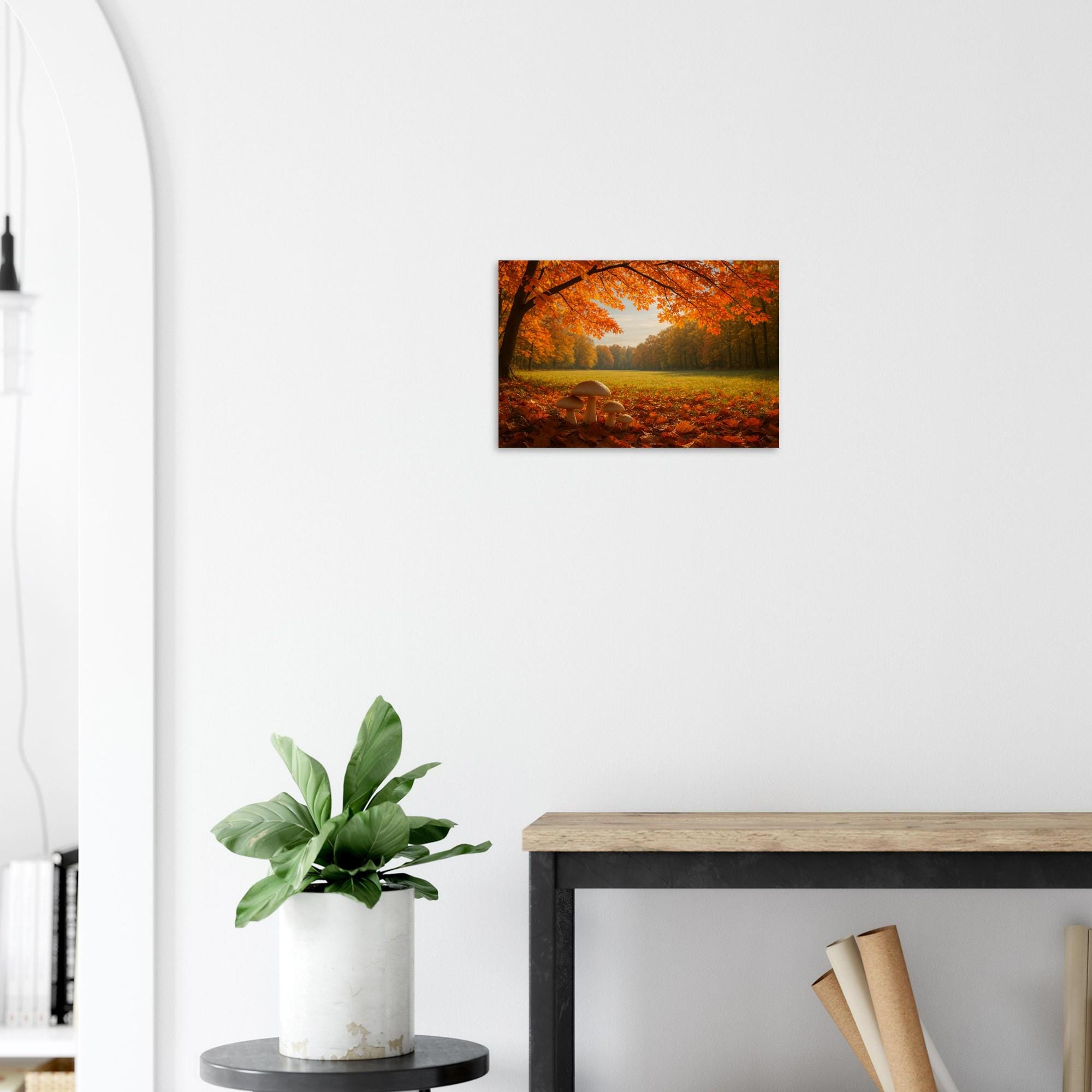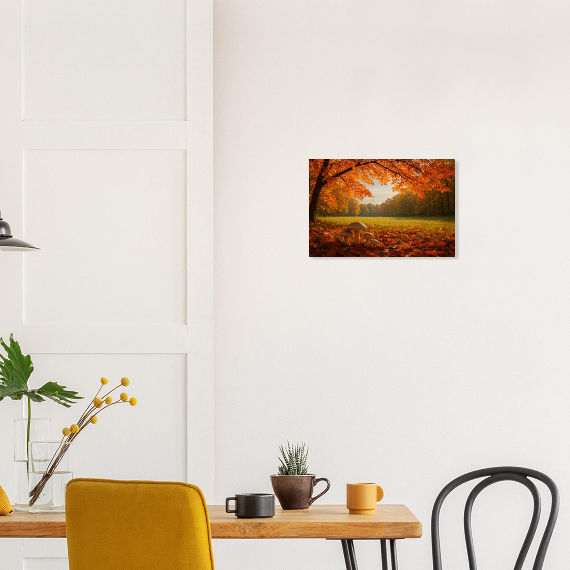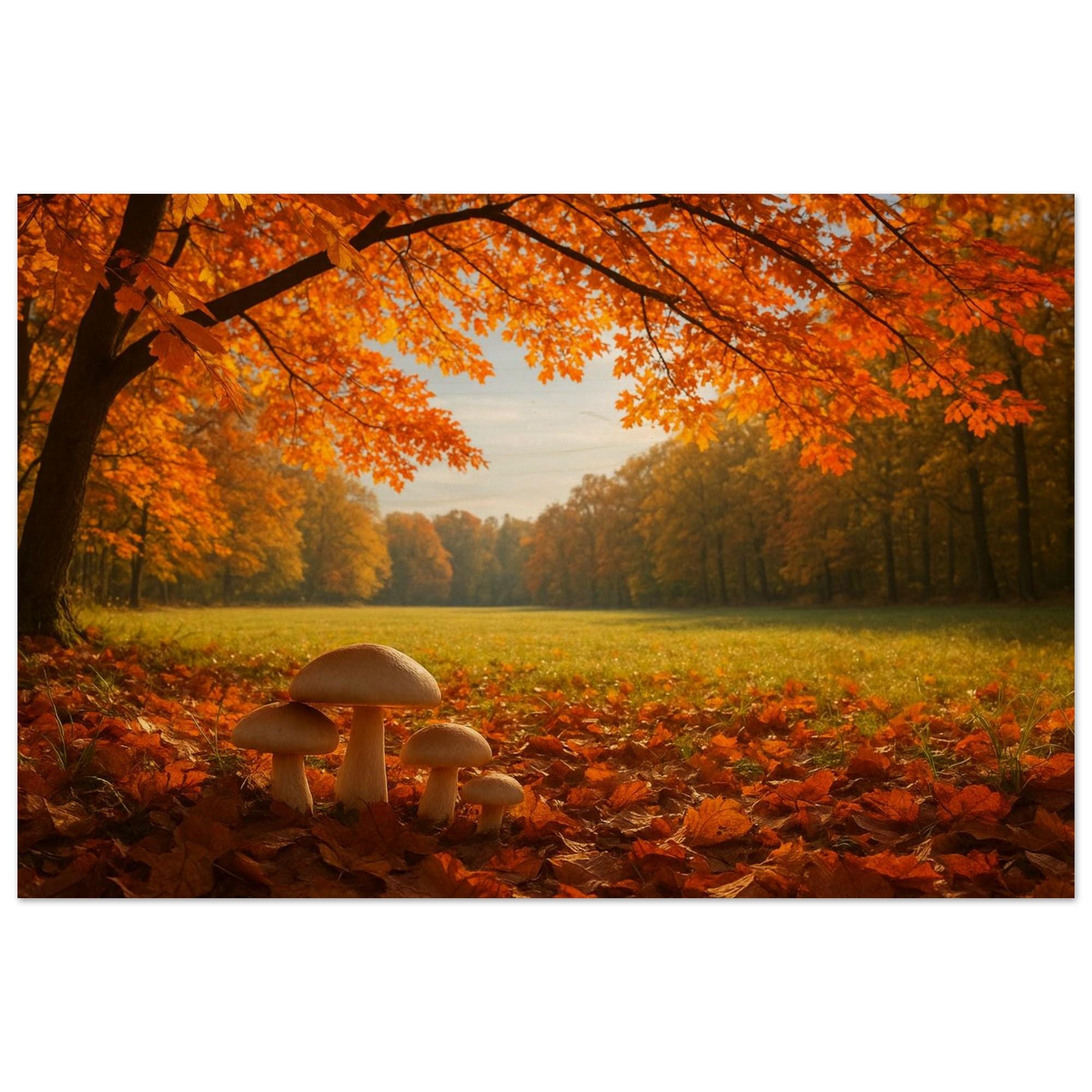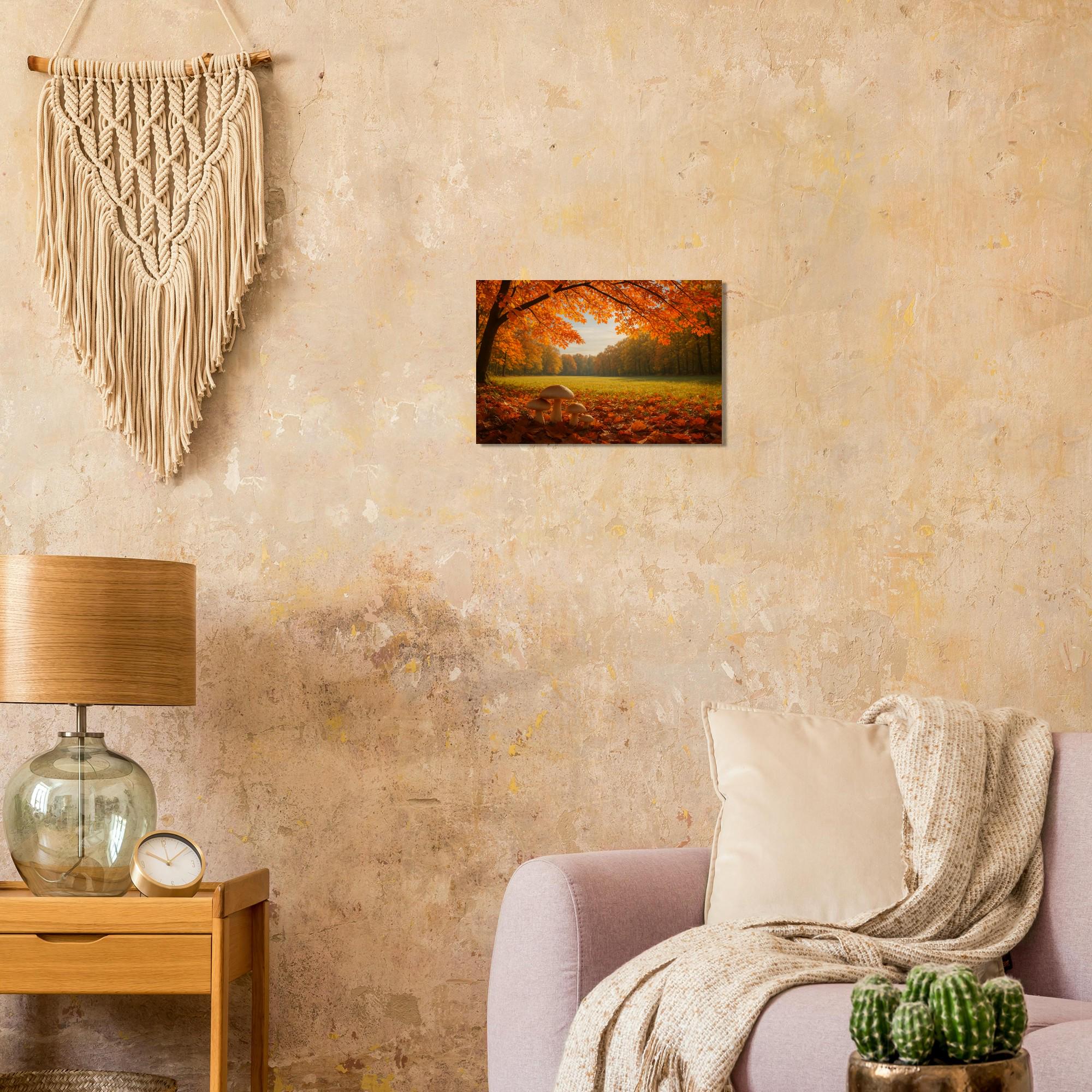Bring the cozy charm of autumn into your home with this warm and inviting fall forest wall art print. Featuring golden leaves, glowing sunlight, and woodland mushrooms at the edge of a meadow, this piece captures the peaceful beauty of nature’s golden season.