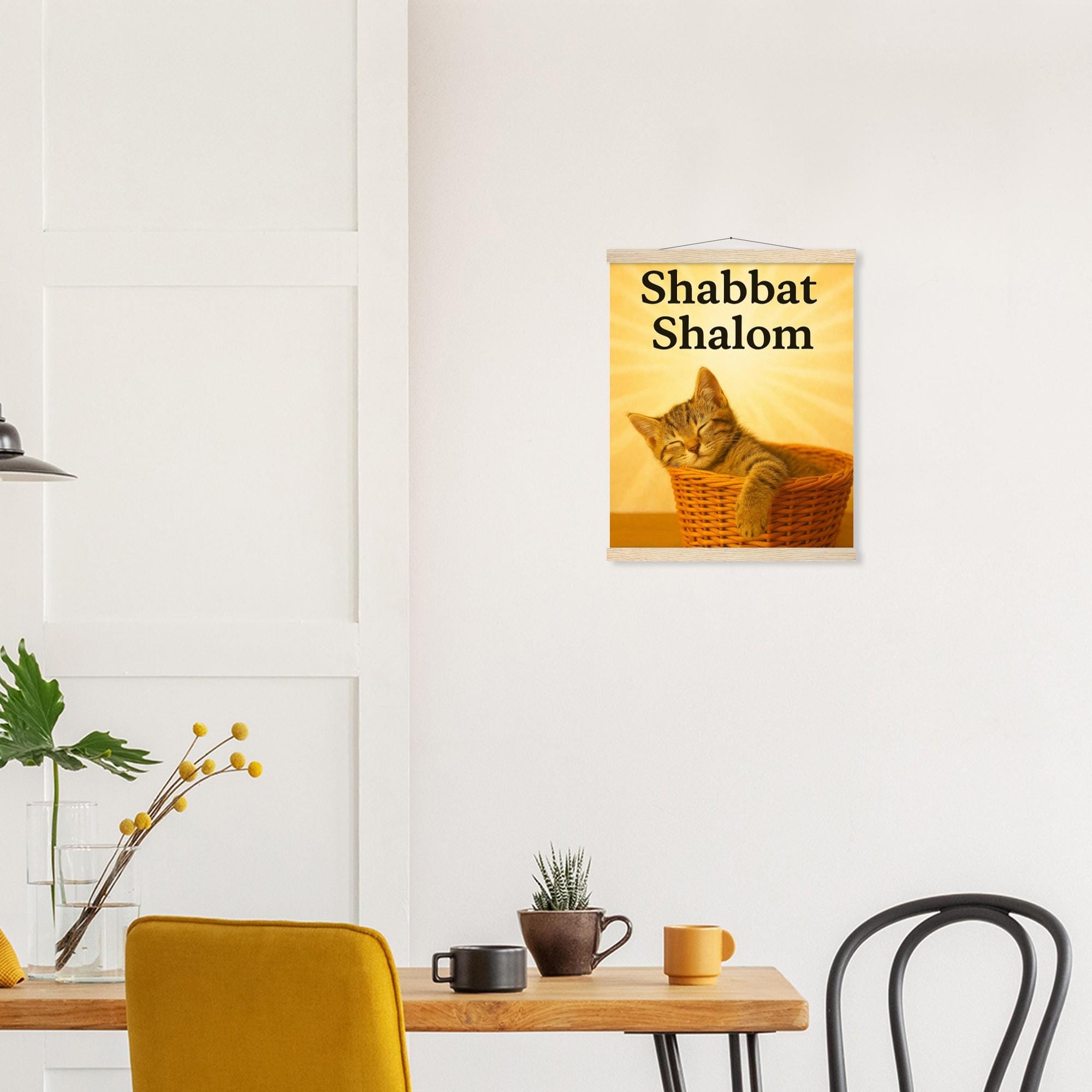 This charming design features a relaxed kitten resting in soft morning light beneath the words “Shabbat Shalom.” Printed on premium matte paper and paired with a natural wooden hanger, it’s ready to display — no frame required. The matte finish gives the artwork a refined, timeless look, perfect for adding a serene touch to any room.