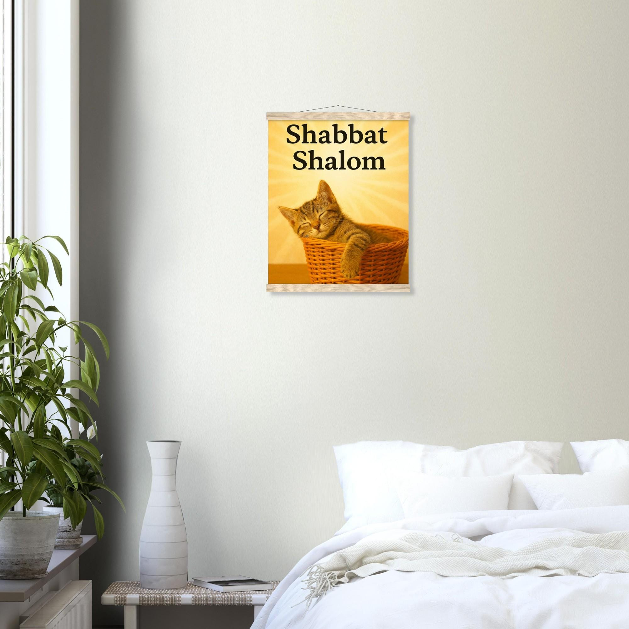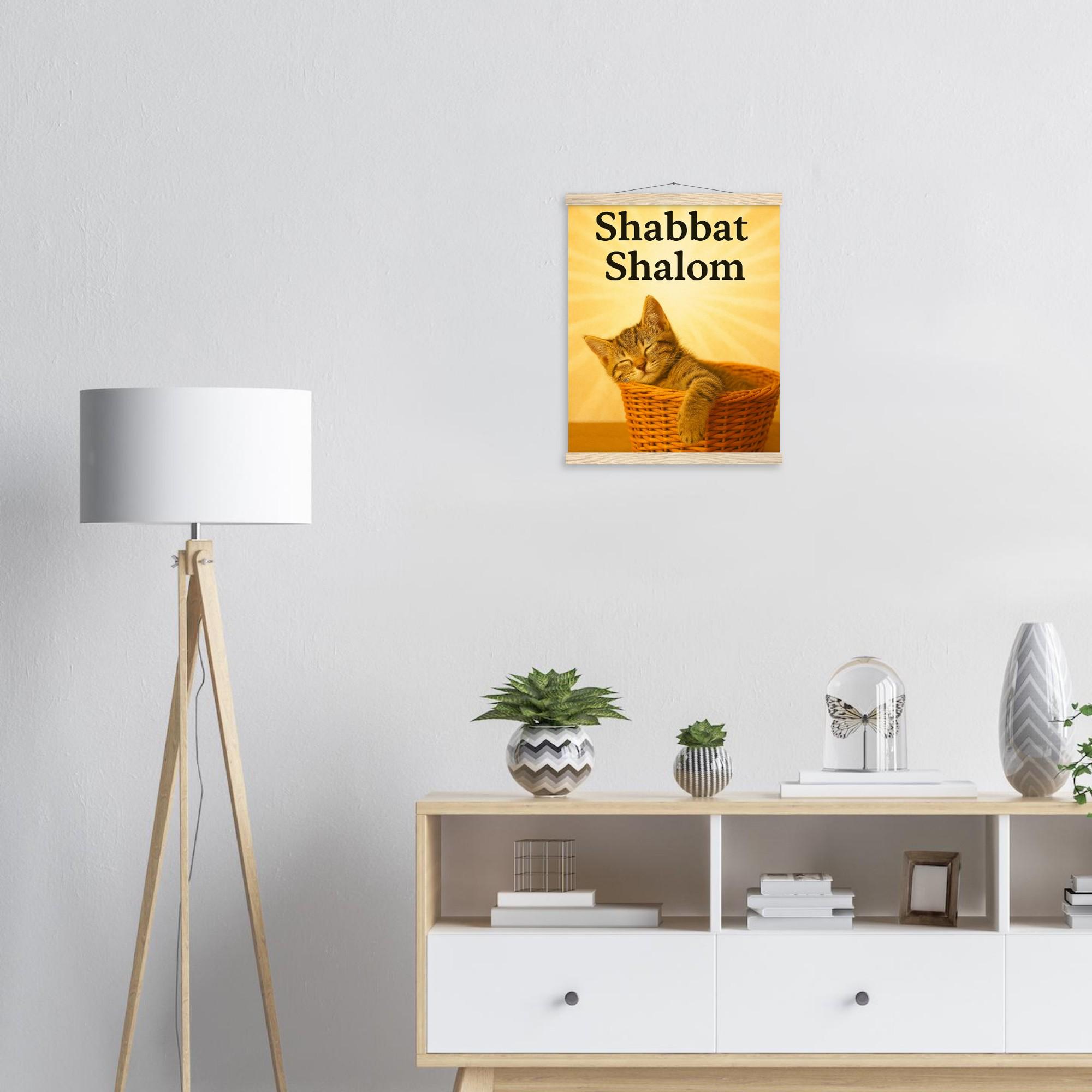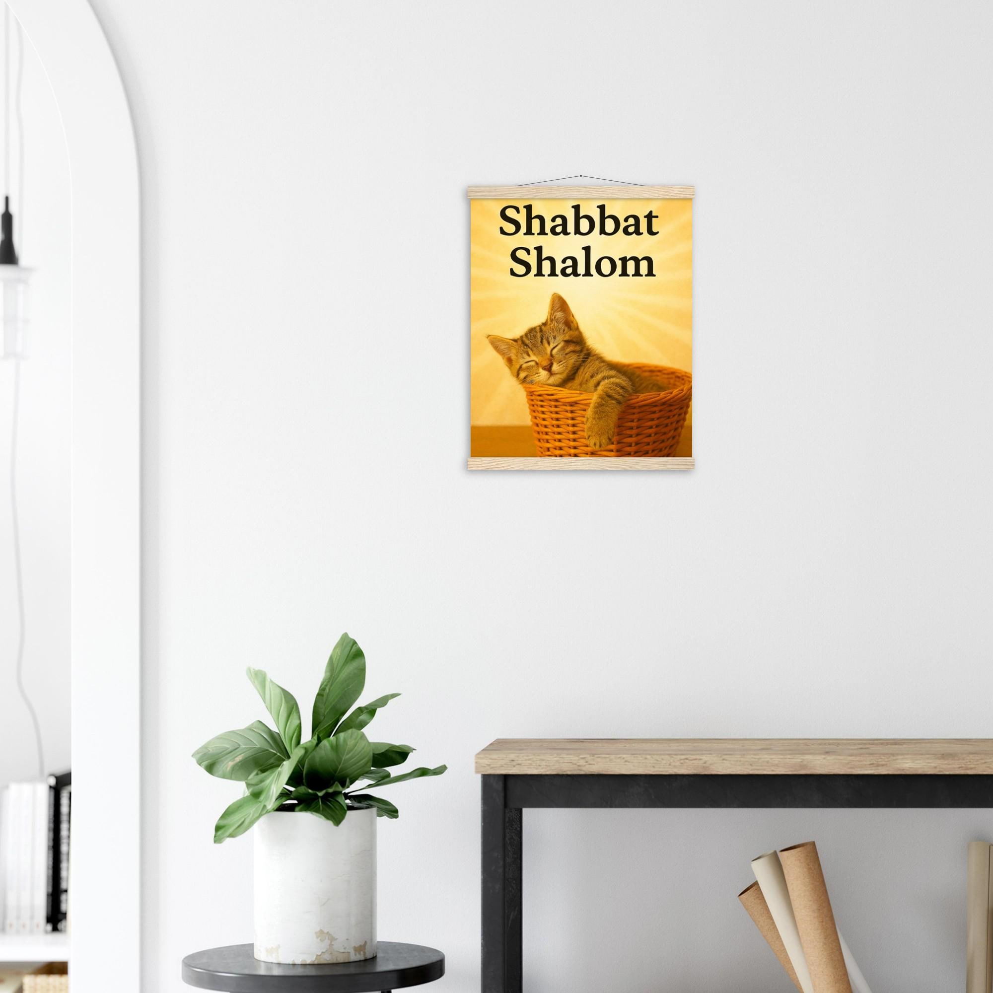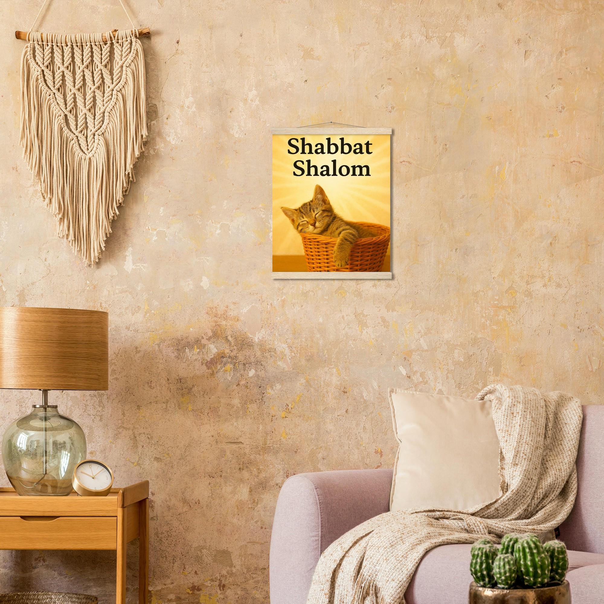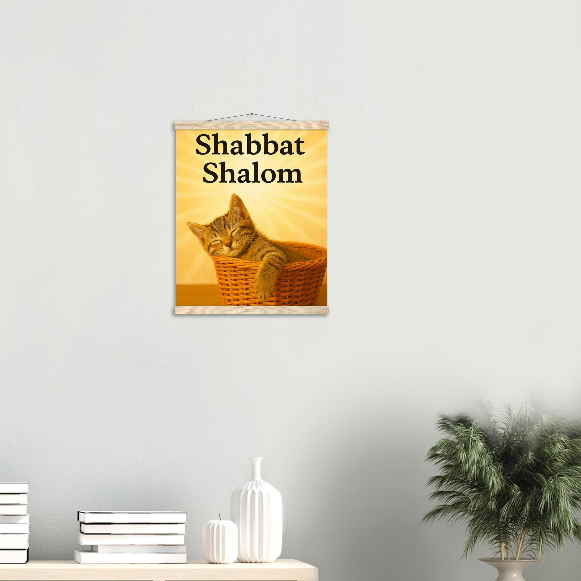 Shabbat Shalom Cat Art Print | Jewish Home Decor with Wooden Hanger
